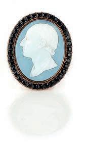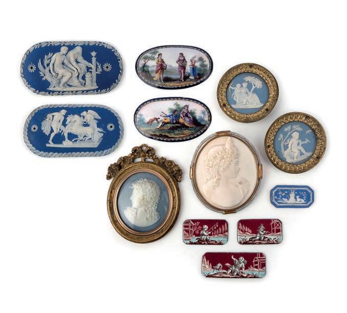 44 A collection of Jasperware and enamel plaques, 18th/19th century, comprising: a framed jasperware cameo of Medusa in a gilt frame, 8.3 x 6.4cm; two smaller Wedgwood jasperware roundels depicting Venus and Cupid, and Cupid respectively, each 5.1cm diameter, each stamped Wedgwood; a smaller cutcornered jasperware plaque depicting a dog and two hearts pierced by an arrow atop an altar, 3.6 x 1.9cm; a pair of jasperware box covers depicting mythological scenes; largest 9.6 x 5.1cm; a plaster cameo of a Bacchante, 6.0 x 6.7cm; a pair of enamel plaques depicting pastoral scenes, each 6.6 x 3.8cm; and three smaller enamel plaques with Chinoiserie scenes, each 3.8 x 2.1cm £50-100