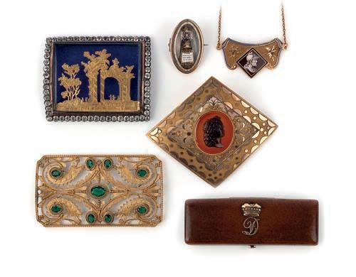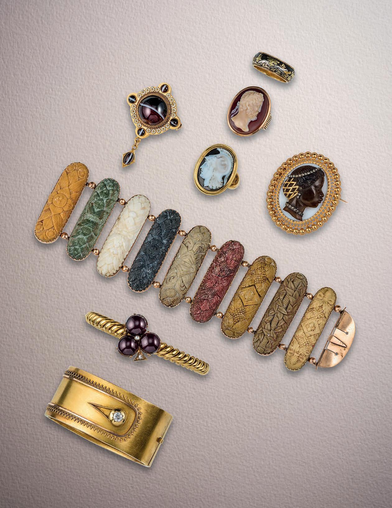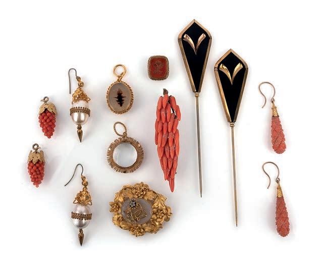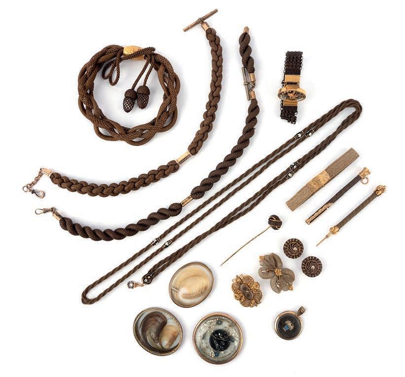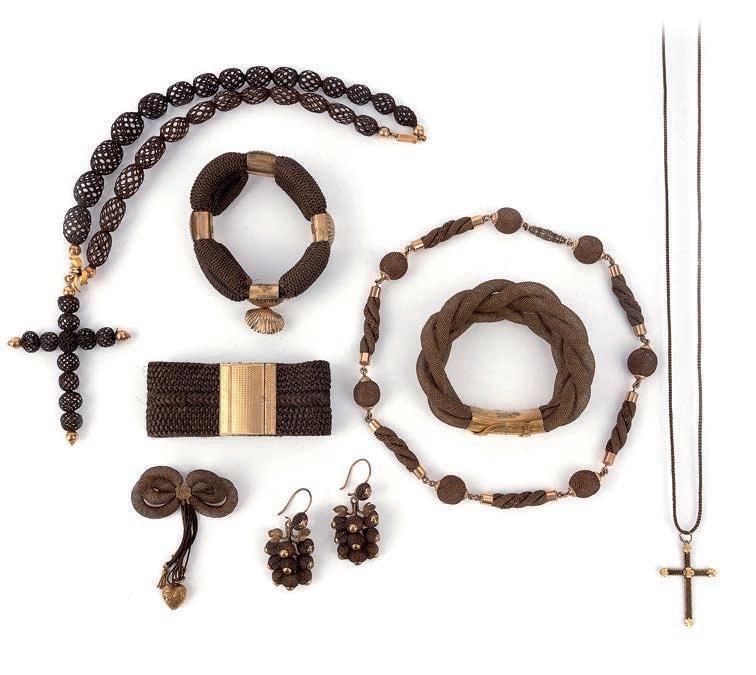 47 A collection of Victorian hair work jewels, mid 19th century, comprising: a floral brooch, length 9.4cm; four bracelets; three necklaces; a gold bangle, inner circumference 17.5cm, gross weight 45 grams; a brooch modelled as a knot; a pair of pendent earrings, length 8.1cm each, hook fittings; and two cross pendants, one set with a hardstone cameo depicting a recumbent lion, longest length 5.2cm £200-300 Cf.: Charlotte Gere and Judy Rudoe, Jewellery in the Age of Queen Victoria: A Mirror to the World, British Museum Press, 2010, p. 1689, for similar examples of Victorian hairwork.
