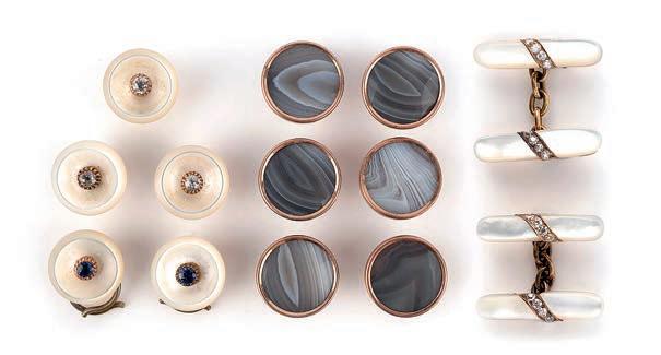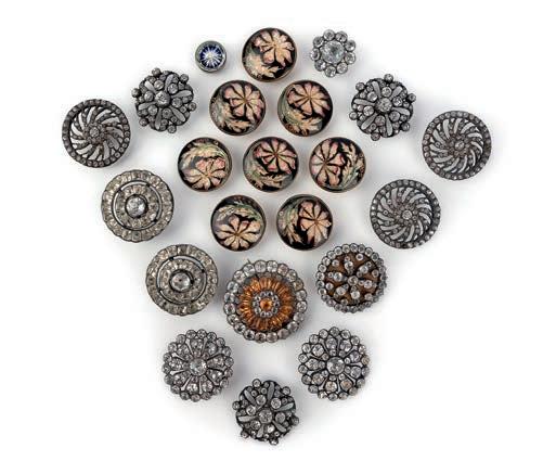 32 A group of buttons, 18th early 20th century, comprising: two pairs and two groups of three matching buttons set with faceted colourless pastes, largest 2.9cm diameter; a button set with orange and colourless pastes adapted as a brooch, 3.6cm diameter; a set of eight buttons set with coloured mother of pearl mosaics depicting floral sprays on a black ground, mounted in gilt metal, diameters 2.4cm each; and three additional paste buttons £50-100