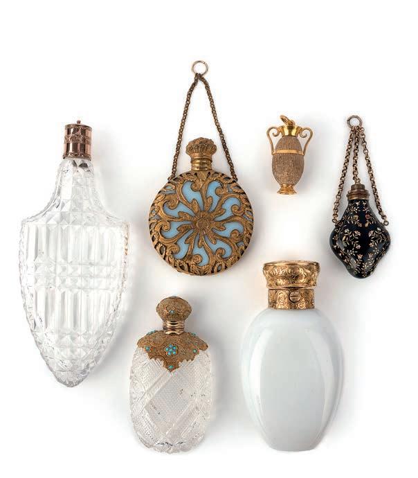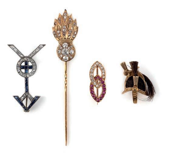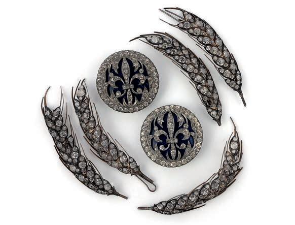 fi ve hair ornaments modelled as wheat sheaves, set with colourless pastes, length 8.2cm, some damages and defi ciencies, replacement fittings; and a pair of buttons of fleur de lis design set with colourless pastes, on a blue glass ground, diameter 3.8cm each £200-300