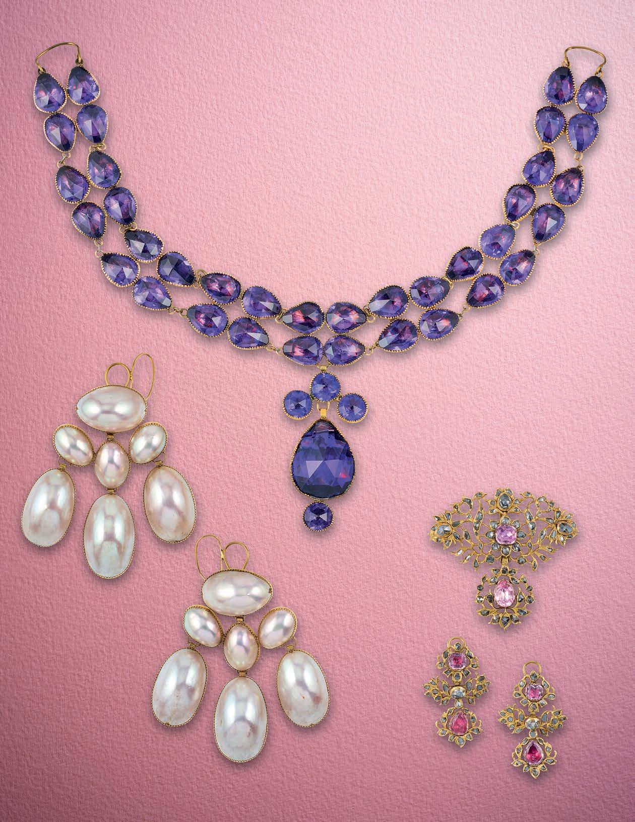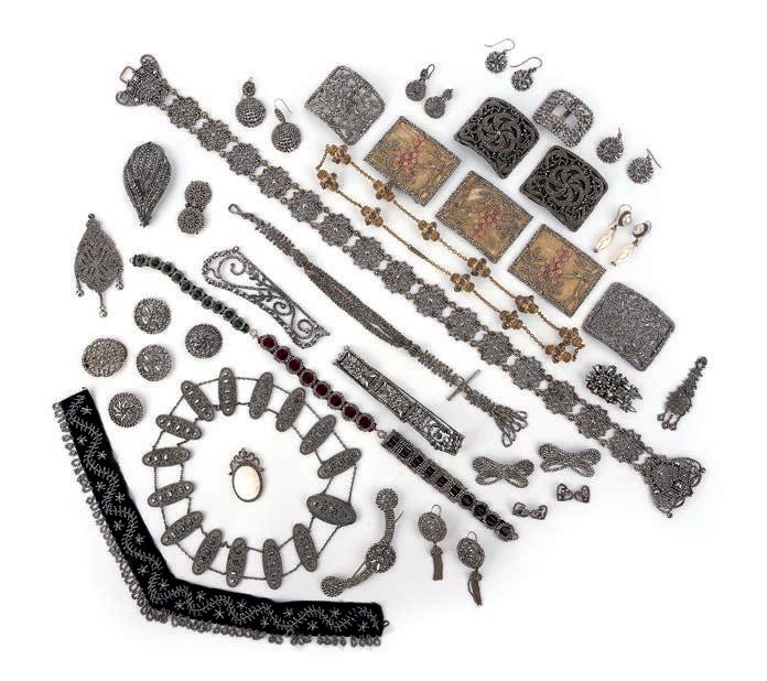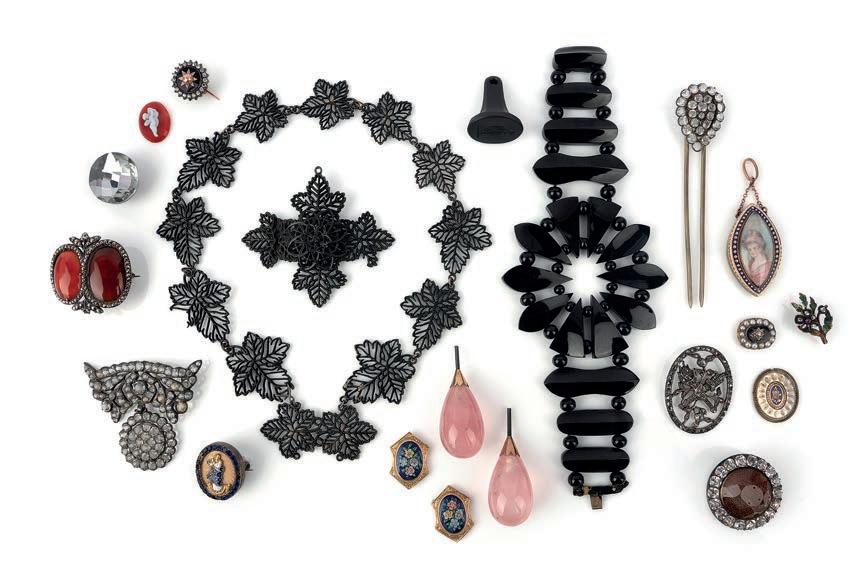 Olivia Collings2 A large collection of cut steel jewels, late 18th/early 19th century, comprising: three necklaces, one composed of oval links connected by two rows of chain, length 47cm, another a choker on a black velvet ribbon; six pairs of earrings, including one set with simulant pearls, longest 6.5cm each, all with hook fittings; a chatelaine; a belt, length 60cm; a bracelet composed of four plaques connected by string; three bracelets on ribbon; five slides; a set of three matching panels accented with pink glass beads and velvet, one with a buckle fitting; four brooches; the side panel of a tiara; two bracelet clasps; the central section of a choker necklace; two pairs of buttons and two heartshaped motifs £200-300