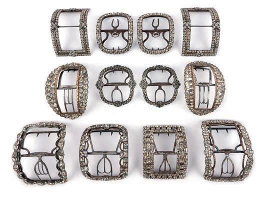 23 A collection of paste shoe buckles, late 18th/early 19th century, comprising: three pairs of buckles set with colourless pastes; together with six assorted buckles, variously set with colourless pastes, mounted in silver and base metal; largest 9 x 6.3cm £200-300