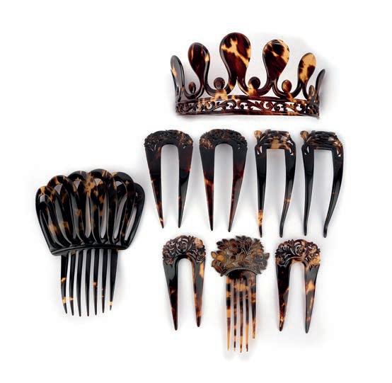 λ 38 A collection of tortoiseshell hair ornaments, 19th century, comprising: two hair combs, largest 15.9 x 12.7cm; a tiara, measuring 19.5 x 6.6cm, three pairs of hair pins and one single hairpin, topped with a design of roses, mounted in silver, length 12.7cm, French patent mark, partially broken £200-300