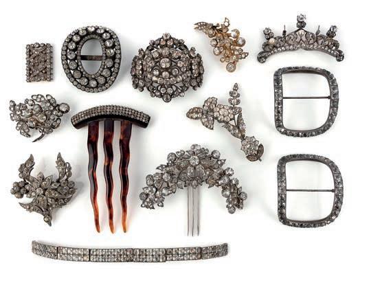 λ 28 A collection of paste jewels, 19th century, comprising: four brooches of floral spray design, set with circularcut pastes, longest 7cm; a buckle brooch of foliate scroll design, length 6cm; an oval buckle and a pair of rectangular shoe buckles, 5.5 x 4.6cm each; a hair ornament of floral spray design set with circularcut and cushionshaped pastes, 7.1 x 8.3cm including comb fitting; a paste and simulant pearl ornament, length 6.6cm; a tortoiseshell and paste comb, length 9.9cm; a paste link bracelet, length 16cm, rivet broken; a black ribbon choker with quatrefoil motifs set with paste stones; and a paste necklace motif and pair of bar links for a necklace £200-300