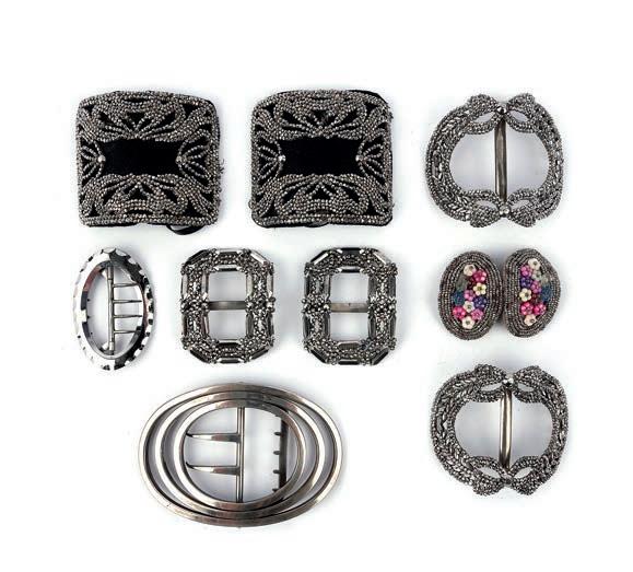 18 A collection of cut steel shoe buckles, 19th century, comprising: four pairs of buckles and one single buckle in cut steel, one ornamented with floral beads, longest 7.4 x 5.4cm; together with a silver buckle, 9 x 6cm £200-300
