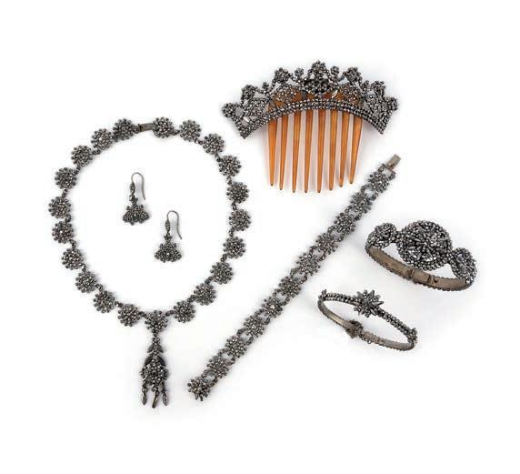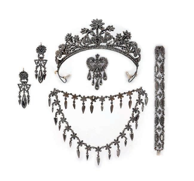 12 A suite of cut steel jewels, 19th century, comprising: a tiara of floral design, inner curve 21.5cm, height at front 4cm; a brooch, length 7.5cm; a necklace suspending a fringe of pendants, length 34cm; a pair of earrings, length 5.8cm each, hook fittings; and a bracelet, length 17cm £200-300