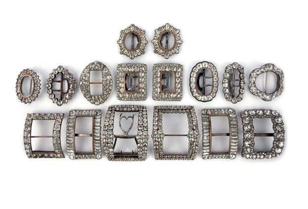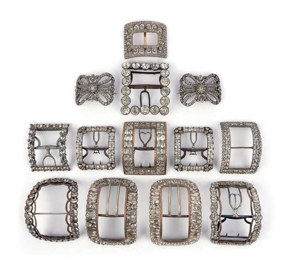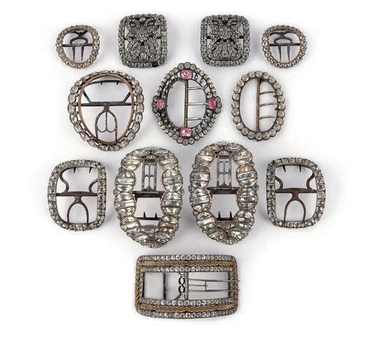 26 A collec ti on of paste shoe buckles, late 18th/early 19th century, comprising: three pairs of buckles set with colourless pastes; together with ten assorted buckles, variously set with colourless pastes, mounted in silver and base metal; largest 5 x 7.3cm 9.6 x 5.9cm, two later adapted as brooches £200-300