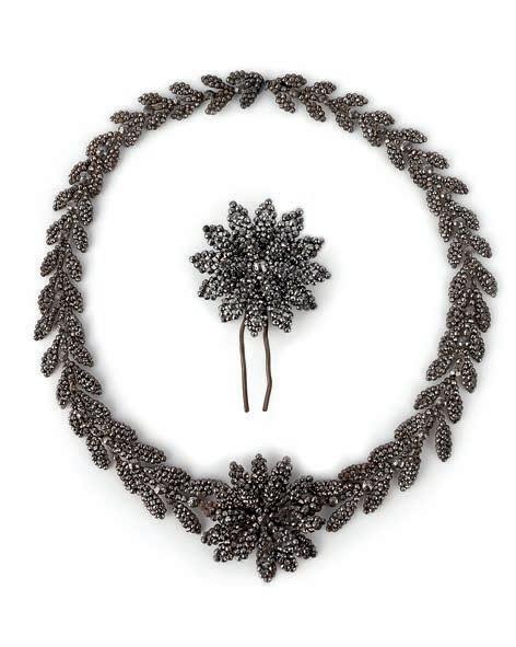 17 A cut steel demiparure, 19th century, comprising: a necklace, centring on a flower, to a necklace composed of articulated laurel leaf linking, set with faceted steel, length 43cm; and a floral hair pin, length 6.9cm £100-150