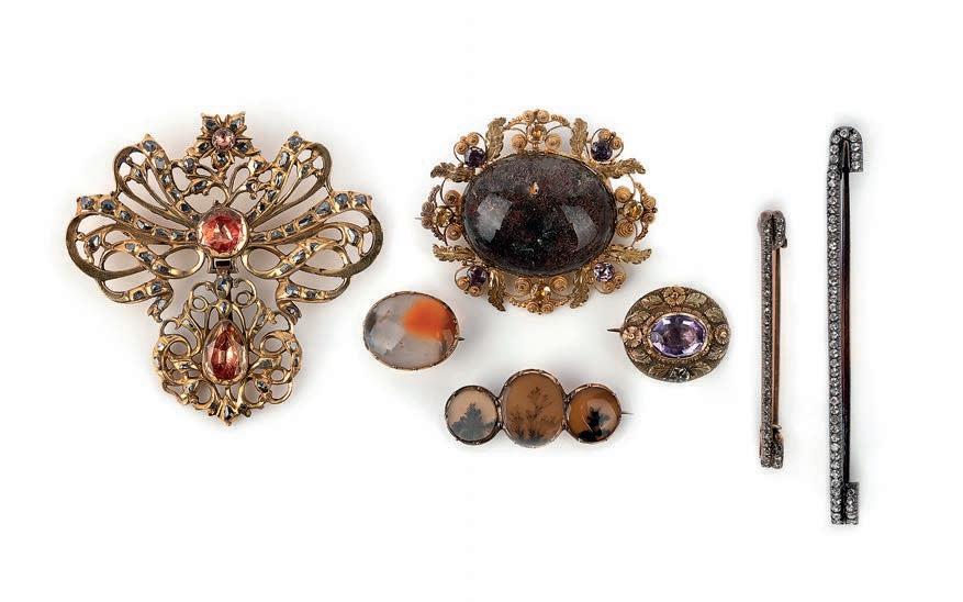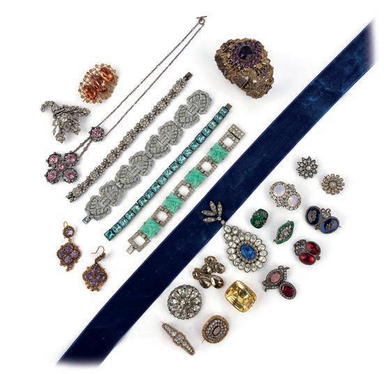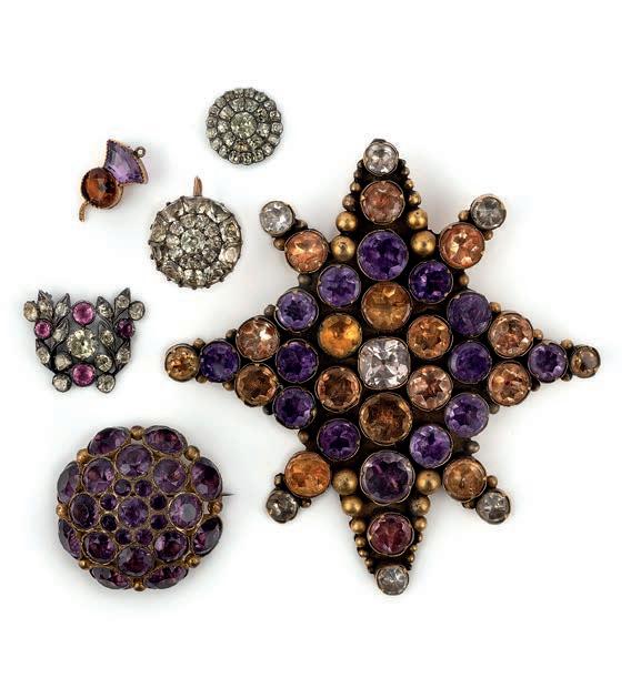 33 A collection of paste jewels, late 18th20th century, comprising: fifteen brooches, including an opaline and colourless paste brooch, later brooch fittings; a brooch set with a large foilbacked yellow paste, and a brooch designed as a bouquet of flowers set with cushionshaped pastes, mounted in silver, largest measuring 5.8 x 5cm, some with later brooch fittings; a purple paste, amethyst and gilt filigree demiparure of earrings and a bangle; a pink and colourless paste necklace; a blue and colourless paste pendant mounted on a blue velvet ribbon; and four bracelets, longest 18.5cm £100-150