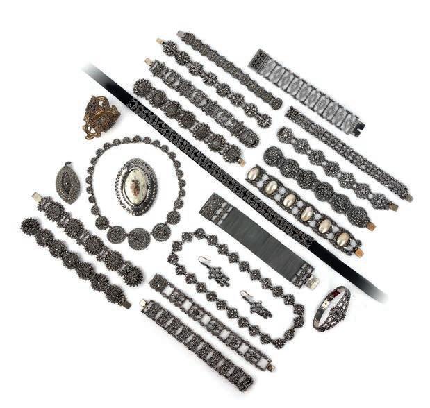 7 A large collection of cut steel jewellery, late 18th/19th century, comprising: three necklaces, including one ribbon choker; a pair of pendent earrings, hook fittings; a gilt metal clip; a pendant; a navetteshaped plaque enclosing a bouquet of flowers to a pink and green ribbon, fitted case; and fifteen bracelets £200-300