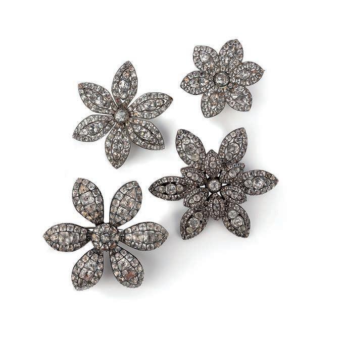 37 A group of paste jewels, late 18th century, the four brooches each designed as flower heads, each set with variously cut pastes in foilbacked settings, mounted in silver, largest 6.8cm diameter, later brooch fittings £200-300
