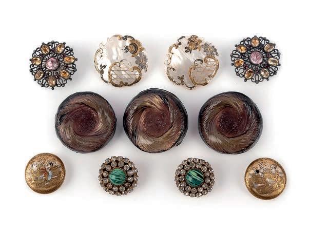 35 A collection of buttons, 19th/20th century, comprising: a group of Art Nouveau moulded glass buttons; a pair of openwork buttons set with yellow, pink and red pastes; a pair of mother of pearl buttons with gold and silver Rococoinspired decorations; a pair of Satsuma ware buttons; and a pair of paste buttons simulating diamonds and malachite, largest 3.8cm diameter £100-200