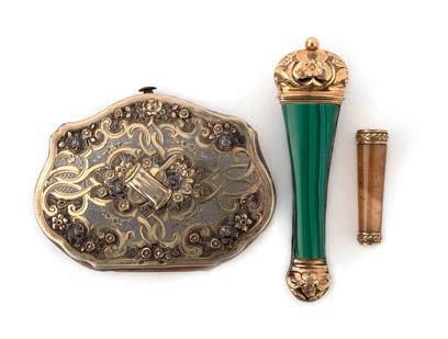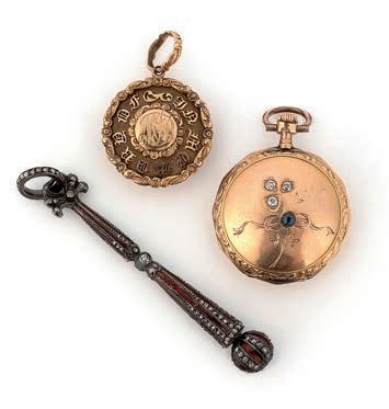45 Two picture frames and an Art Nouveau leather case, late 19th/early 20th century, comprising: an oval picture frame of scrolled design, set with rosecut garnets, mounted in gilt metal, length 7cm; an oval doublesided picture frame mounted in gold, length 5.9cm; and an Art Nouveau leather case of Japanese inspiration, capped with gilt metal foliate scrollwork, 17.7 x 12.0 x 2.7cm, indistinct stamped gilt signature, possibly Mappin & Webb £200-300