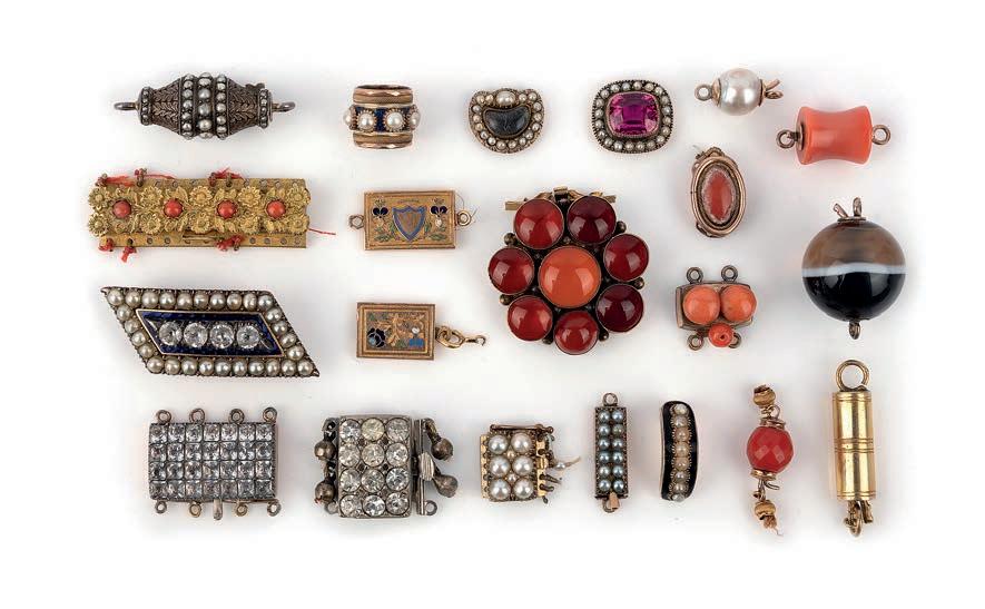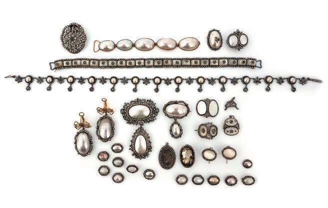 15 A group of coque de perle, mother of pearl and marcasite jewels, mid 18th century and later, comprising: a coque de perle and marcasite pendant, length 7.9cm; together with three coque de perle and marcasite brooches, later brooch fittings; a mother of pearl and marcasite choker, length 26cm, hoop fittings intended for a ribbon; a pair of coque de perle and marcasite earrings, later mounted as earrings with gilt metal surmounts, length 5.2cm each, composite; a simulant pearl and cut steel necklace of fringe design, length 39cm; a marcasite necklace clasp; a section of coque de perle linking in gilt metal, length 14cm; a and a collection of similar jewel components variously set with mother of pearl, marcasite and coque de perle £100-150