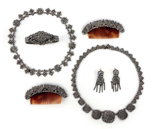 λ 10 A suite of cut steel jewels, 19th century, comprising: a pair of hair ornaments with tortoiseshell fi tti ngs, length 9cm each; two necklaces, length of longest 37cm; a bangle, inner circumference 17.3cm; and a pair of earrings suspending a fringe of pendants, length 5.3cm, hook fittings, each of geometric design, set with faceted steel £200-300