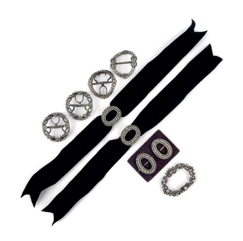 31 A collec ti on of paste shoe buckles, 19th century, comprising: one pair and one set of four buckles, together with three addi ti onal buckles, each set with colourless pastes, mounted in silver and base metal; largest 6.4 x 4.6cm £200-300