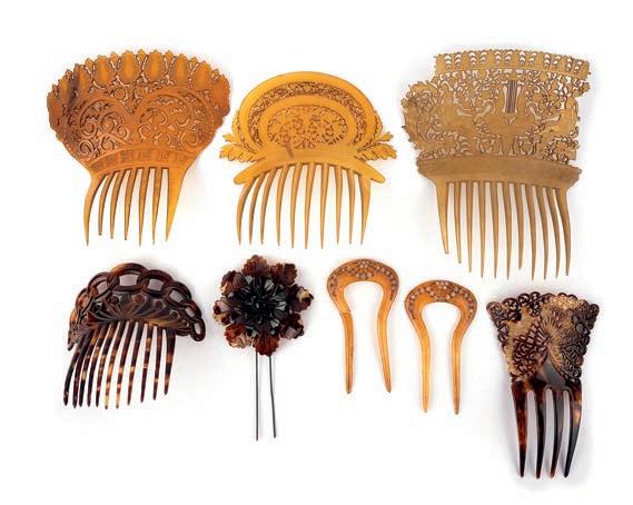 λ 40 A collection of tortoiseshell hair ornaments, 19th century, comprising: three large finely carved hair combs in blonde tortoiseshell, largest 18.5 x 16cm, partially broken; two smaller hair combs; a hair pin modelled as a flower; and a pair of hair pins set with circular pastes; one broken £200-300
