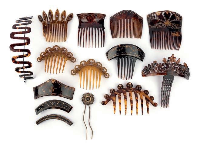 λ 39 A collection of tortoiseshell hair ornaments, 19th century, comprising: a headband of meander design, fastened by a later elastic cord; three haircomb tops; a hair pin, and nine hair combs including one pair, variously designed and accented with gold and silver piqué work, largest 16 x 9.5cm £200-300