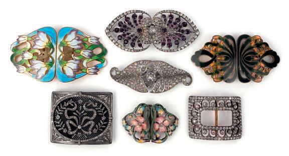 29 A collection of enamel and paste buckles, late 19th/early 20th century, comprising: three Art Nouveau buckles of floral design, applied with bassetaille enamel, largest 10.1 x 5.6cm; together with an Edwardian buckle designed as a pierced plaque set with colourless pastes; a fine buckle modelled as leaves of convolvulus set with colourless pastes; a buckle of palmette design set with violet and colourless pastes; and a rectangular buckle set with colourless pastes, largest 9.7 x 4.4cm £1,5002,000