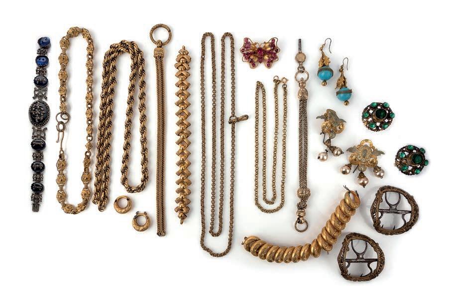 46 A group of paste and gilt metal jewels, 19th century, comprising: eight gilt metal fancy link bracelets and necklaces, longest 98cm, clasps deficient; two gilt metal hat pins set with green pastes; a pair of gilt metal shoe buckles; a blue glass and marcasite bracelet, some panels of blue glass detached; and a pair of gilt metal and simulant pearl earrings, length 5.3cm each, a pair of paste and gilt metal earrings, length 6cm each; and a pink paste butterfly brooch, length 4.4cm £100-150