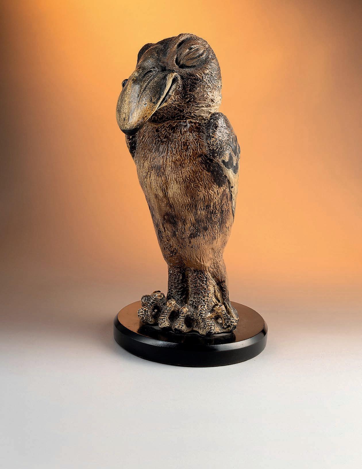 In 1907, Wallace created one of the masterpieces of Martinware, the Bird Man. Here again Wallace finds in the pages of Wright’s History of Caricature and Grotesque in Literature and Art an image to help him through an emotional crisis. For about ten years, Wallace’s younger brothers, Walter and Edwin, had been persistently demanding a more equitable share of the firm’s assets; they were afraid that Wallace would die leaving everything to his wife and son. Wallace acknowledged their right but did nothing. Rancour pervaded the Southall pottery and the Holborn Street shop, just as it had poisoned the atmosphere at the Kennington meetings during the Cronin affair. Wallace recalled an illustration in Wright’s book, a woodcut from an early blockbook, the Ars Moriendi (The Art of Dying). It shows a dying man on his deathbed attended by his relatives and three grotesque demons, each urging the cause of the respective parties. One, who is whispering in the dying man’s ear, has the head of a viciouslooking bird of prey on a wellmuscled human torso. He warns his client to guard his fortune.