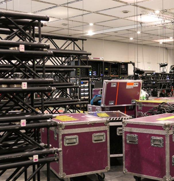 eingebaute Decke, die sowohl als Licht- als auch als Akustikdecke funktioniert komplett ebenerdig und befahrbar bis 40 t gut 1.000 m² Backstage-/ Gesprächsbereich im 1. Obergeschoss