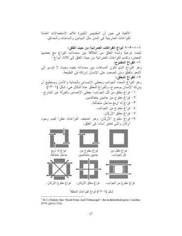 ﺍﻷﻓﻨﻴﺔ ﻓﻲ ﺤﻴﻥ ﺃﻥ ﺍﻟﻤﻘﺎﻴﻴﺱ ﺍﻟﻜﺒﻴﺭﺓ ﺘﻼﺌﻡ ﺍﻻﺴﺘﻌﻤﺎﻻﺕ ﺍﻟﻌﺎﻤﺔ ﻟﻠﻔﺭﺍﻏﺎﺕ ﺍﻟﺨﺎﺭﺠﻴﺔ ﻓﻲ ﺍﻟﻤﺩﻥ ﻤﺜﻝ ﺍﻟﻤﻴﺎﺩﻴﻥ ﻭﺍﻟﺴﺎﺤﺎﺕ ﻭﺍﻟﺤﺩﺍﺌﻕ. ٢-٣-١-١ﺃﻨﻭﺍﻉ ﺍﻟﻔﺭﺍﻏﺎﺕ ﺍﻟﻌﻤﺭﺍﻨﻴﺔ ﻤﻥ ﺤﻴﺙ ﺍﻟﻐﻠﻕ: ﺘﺘﺤﺩﺩ ﻨﻭﻋﻴﺔ ﻭﺸﺩﺓ ﺍﻟﻐﻠﻕ ﻤﻥ ﺍﻟﻌﻼﻗﺔ ﺒﻴﻥ ﻤﺤﺩﺩﺍﺕ ﺍﻟﻔﺭﺍﻍ ﻤﻊ ﺒﻌﻀﻬﺎ ﺍﻟﺒﻌﺽ ،ﻭﺘﻘﺴﻡ ﺍﻟﻔﺭﺍﻏﺎﺕ ﺍﻟﻌﻤﺭﺍﻨﻴﺔ ﻤﻥ ﺤﻴﺙ ﺍﻟﻐﻠﻕ ﺇﻟﻰ ﺜﻼﺙ ﺃﻨﻭﺍﻉ:١ -١ﺍﻟﻔﺭﺍﻍ ﺍﻟﻤﻔﺘﻭﺡ: ﻭﻫﻭ ﺍﻟﻔﺭﺍﻍ ﺍﻟﺫﻯ ﺘﻜﻭﻥ ﺍﻟﻤﺴﺎﻓﺎﺕ ﺒﻴﻥ ﻤﺤﺩﺩﺍﺘﻪ ﺒﻌﻴﺩﻩ ﺒﺤﻴﺙ ﻻ ﺘﺅﺩﻯ ﺇﻟﻰ ﺍﻟﺸﻌﻭ ﺒﺎﻟﻐﻠﻕ ﻭﻤﻥ ﺍﻟﺼﻌﺏ ﻋﻠﻰ ﺍﻹﻨﺴﺎﻥ ﺇﺩﺭﺍﻜﻪ ﻓﻰ ﺍﻟﻁﺒﻴﻌﺔ. -٢ﺍﻟﻔﺭﺍﻍ ﺍﻟﻤﻐﻠﻕ: ﻭﻫﻭ ﺍﻟﻔﺭﺍﻍ ﺍﻟﻤﺤﺩﺩ ﺍﻟﺠﻭﺍﻨﺏ ﻭﻴﻌﻁﻰ ﺍﻹﺤﺴﺎﺱ ﺒﺎﻟﺤﻤﺎﻴﺔ ﻭﺍﻷﻤﺎﻥ ﻭﻴﺴﺘﻁﻴﻊ ﺃﻥ ﻴﺩﺭﻜﻪ ﺍﻹﻨﺴﺎﻥ ﺒﻭﻀﻭﺡ ،ﻭﻟﻠﻔﺭﺍﻍ ﺍﻟﻤﻐﻠﻕ ﻋﺩﺓ ﺃﺸﻜﺎﻝ ﻫﻲ :ﺸﻜﻝ )(١٣-١ -١ﻓﺭﺍﻍ ﻤﻐﻠﻕ ﻤﻥ ﻜﻝ ﺍﻟﺠﻭﺍﻨﺏ :ﻴﻌﻁﻰ ﺍﻹﺤﺴﺎﺱ ﺒﺎﻟﻌﺯﻟﺔ ﻋﻥ ﺍﻟﺨﺎﺭﺝ. -٢ﻓﺭﺍﻍ ﻤﻔﺘﻭﺡ ﻤﻥ ﺠﺎﻨﺒﻴﻥ ﻤﺘﻌﺎﻜﺴﻴﻥ. -٣ﻓﺭﺍﻍ ﻟﻪ ﺃﺭﺒﻊ ﻤﺩﺍﺨﻝ ﻤﺘﺨﺎﻟﻔﺔ. -٤ﻓﺭﺍﻍ ﻤﻔﺘﻭﺡ ﻤﻥ ﺍﻟﺠﻭﺍﻨﺏ. -٥ﻓﺭﺍﻍ ﻤﻐﻠﻕ ﺍﻷﺭﻜﺎﻥ. -٦ﻓﺭﺍﻍ ﻤﻔﺘﻭﺡ ﺍﻷﺭﻜﺎﻥ :ﻭﻫﻭ ﺃﻀﻌﻑ ﺍﻟﻔﺭﺍﻏﺎﺕ ﻨﻅﺭﺍ ﻟﻌﺩﻡ ﻭﺠﻭﺩ ﺃﺭﻜﺎﻥ ﻭﺍﻟﺘﻰ ﺘﻌﺘﺒﺭ ﺃﺴﺎﺴﺎ ﻓﻰ ﺍﻟﻐﻠﻕ.