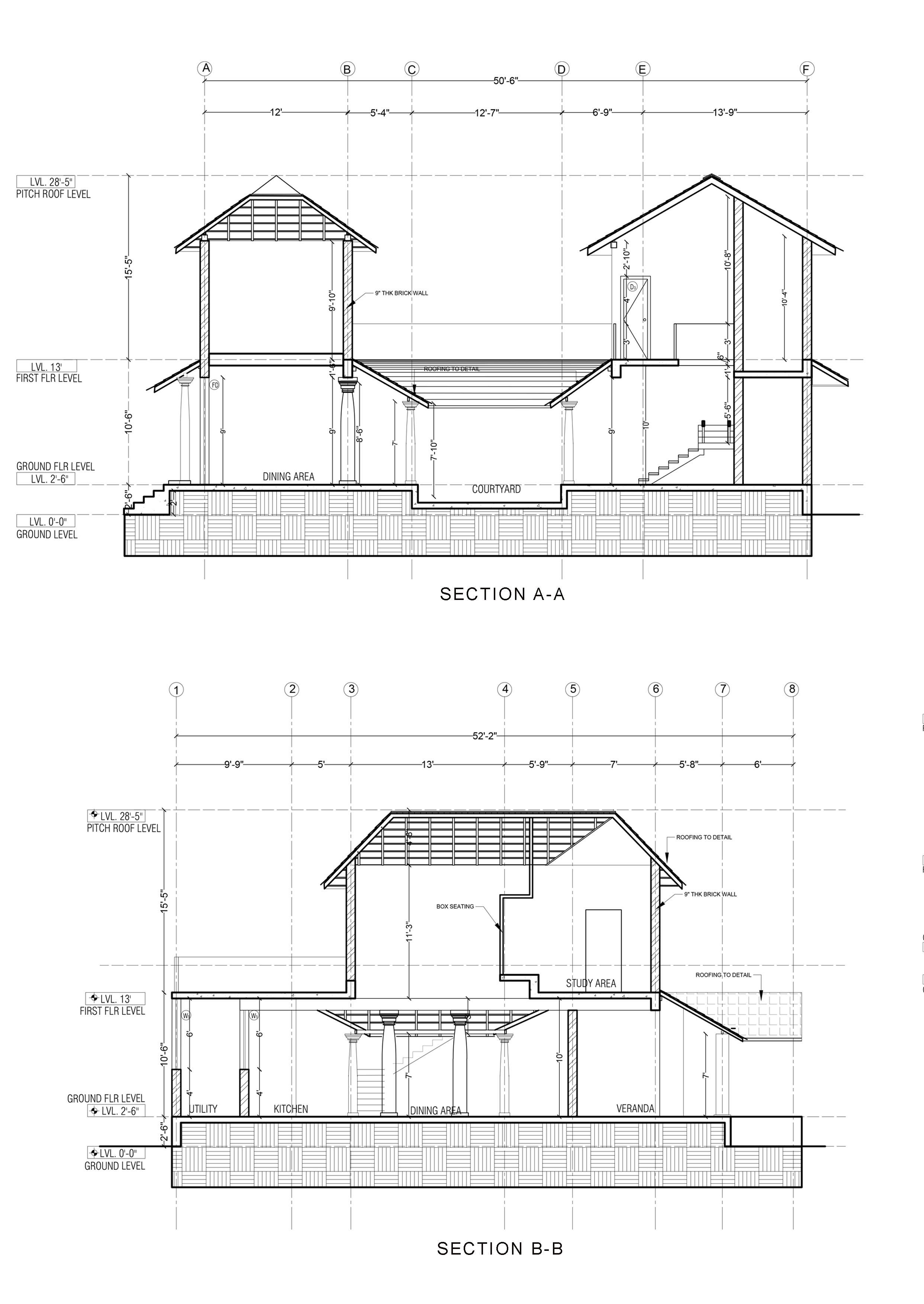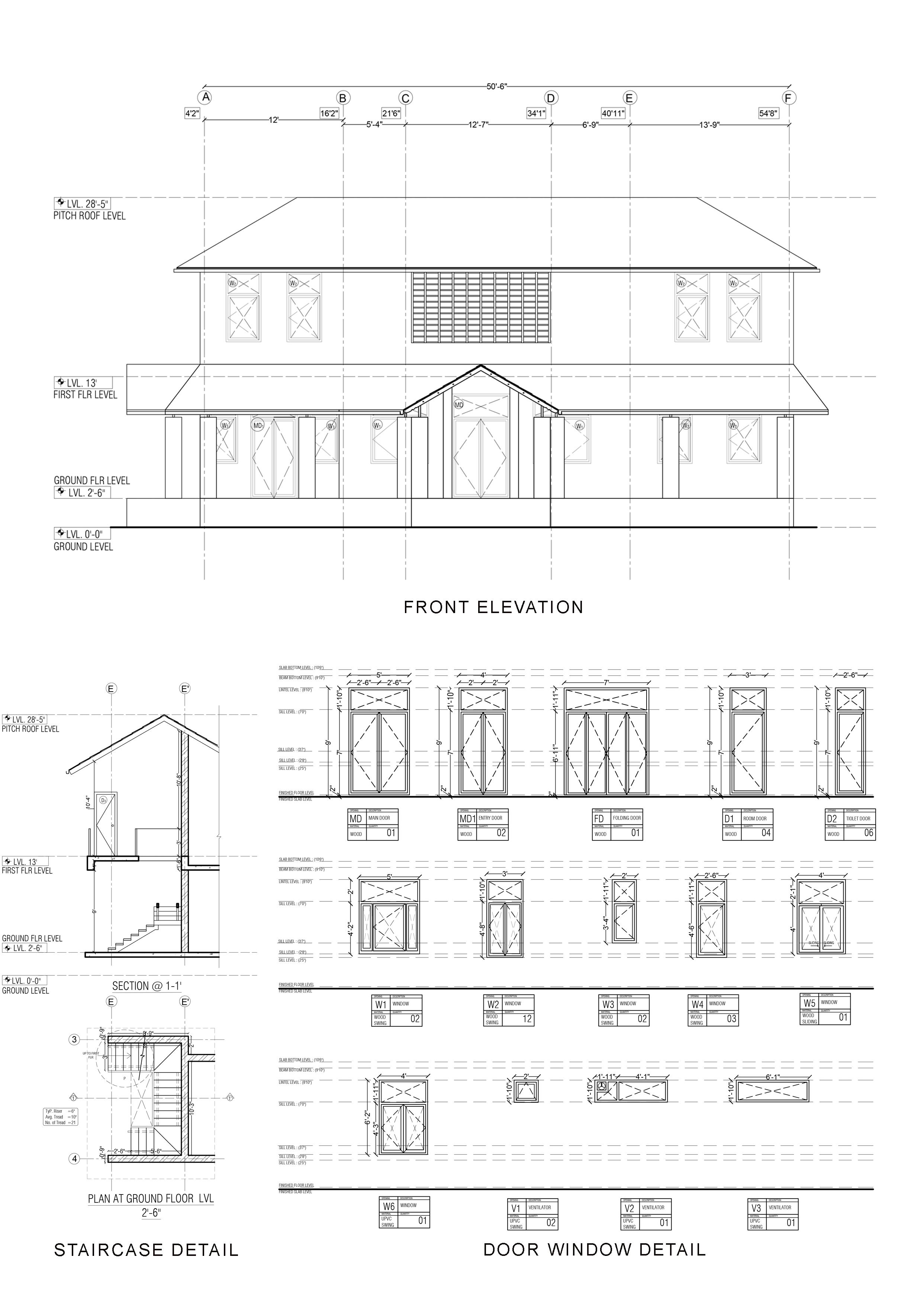 F E D C B A (+0'-0")lvl level of road crown (+2'-0")lvl car parking unfinished lvl (+28'-0")lvl top of parapet wall (+24'-0")lvl top of first floor roof slab (+15'-0")lvl top of ground floor roof slab (+4'-0")lvl ground floor unfinished lvl