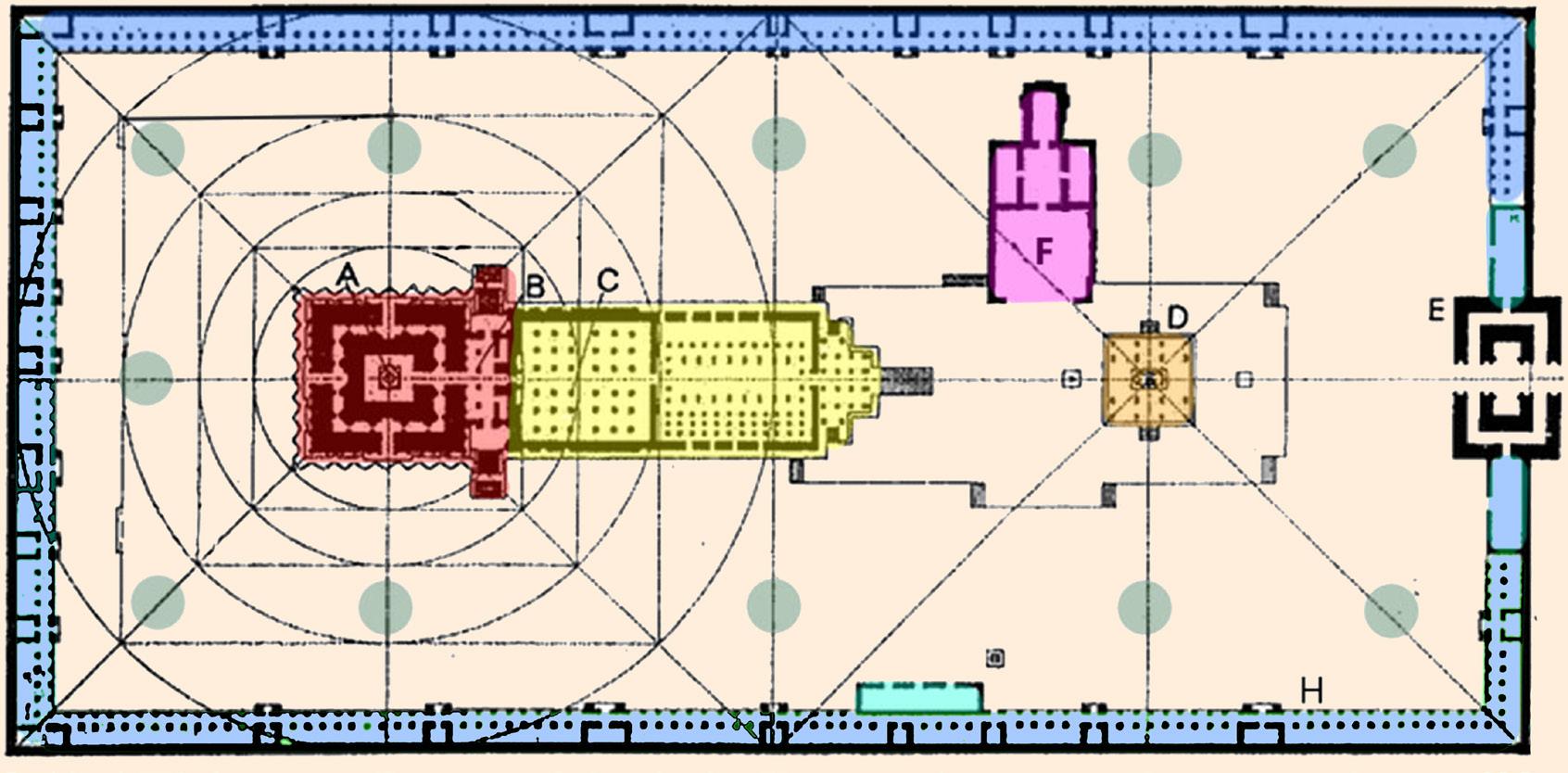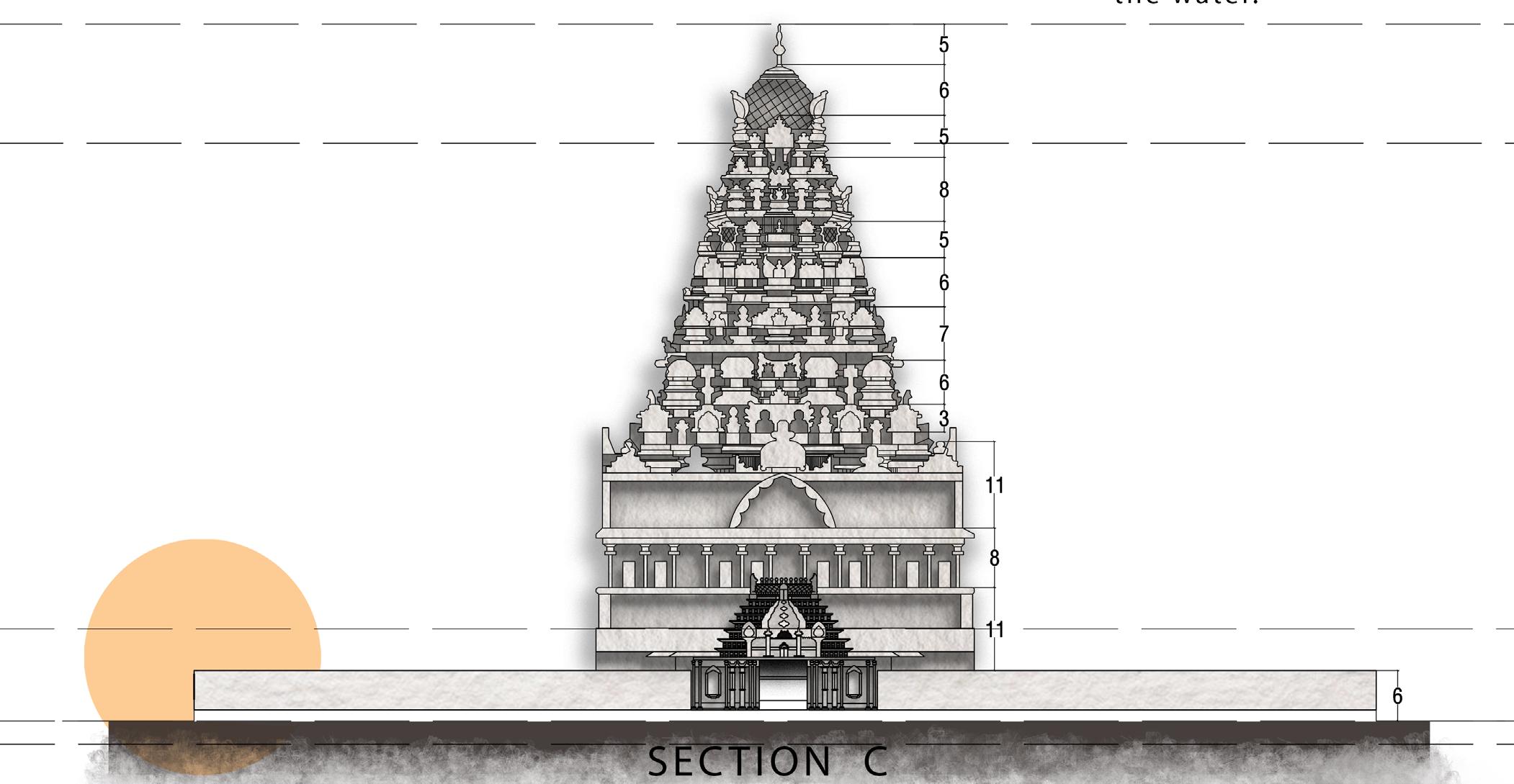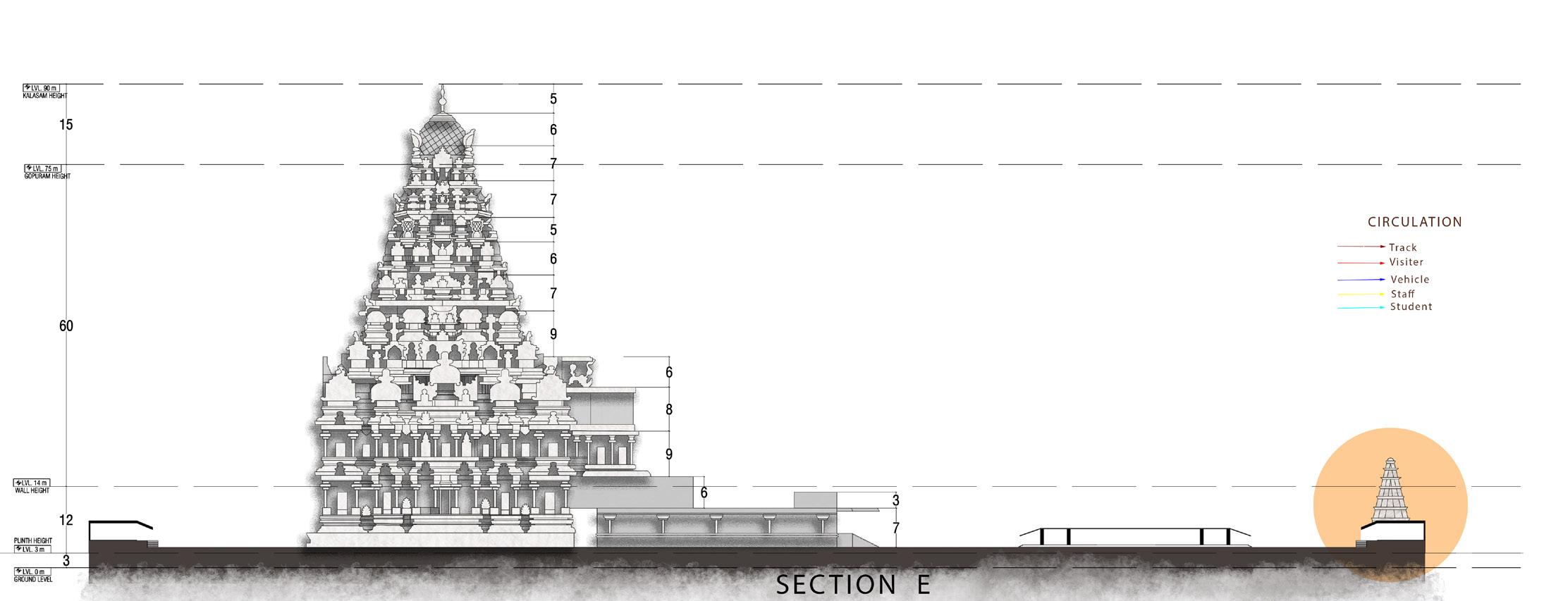 A-Meditation space C-Heritage gallery D-Golden roof E-Natya Karna F-Natya sabha G-Entry gopuram