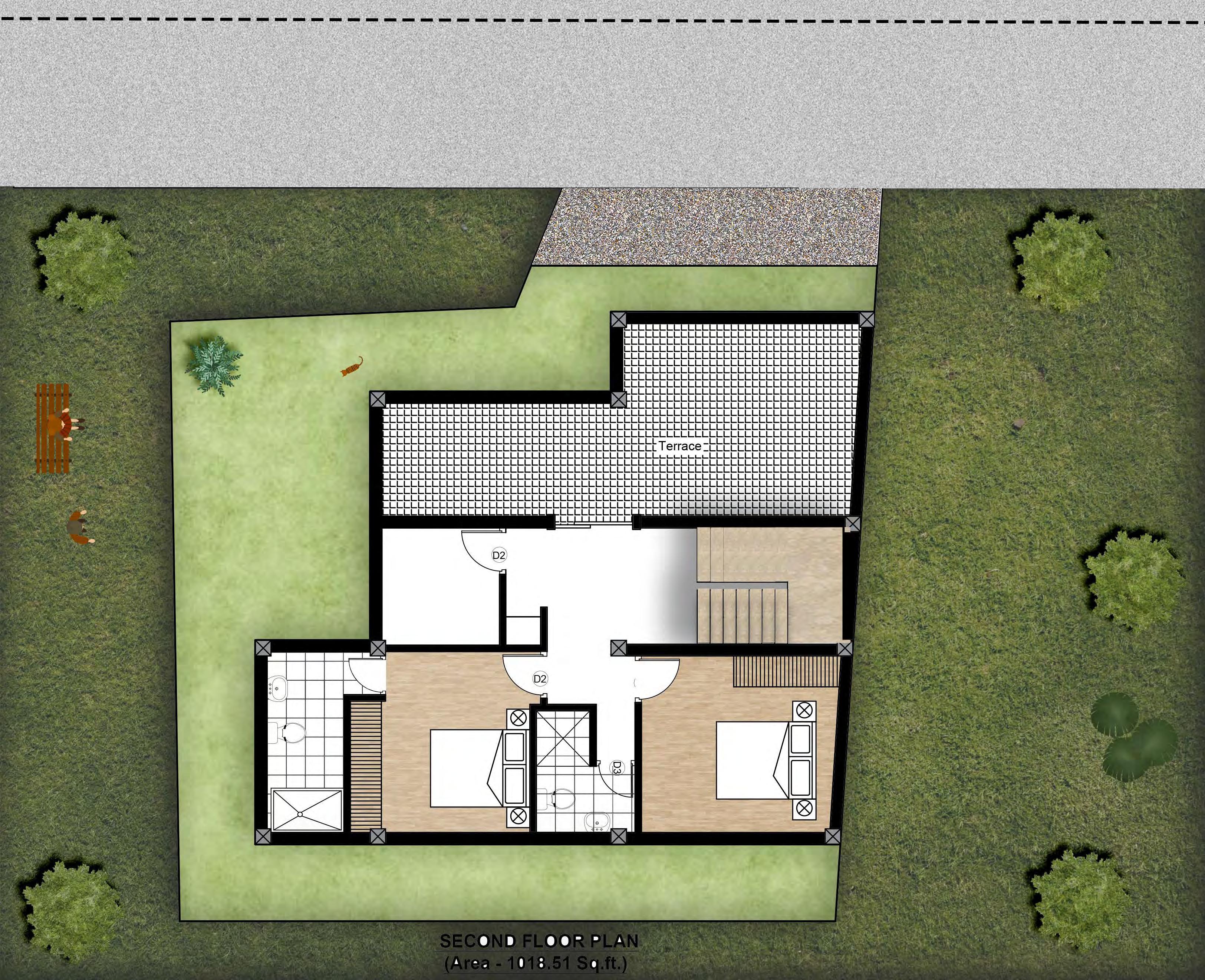 SECOND FLOOR PLAN (Area - 1018.51 Sq.ft.) Dn D2 Bedroom D3 D3 D2 D2 Terrace PUJA
