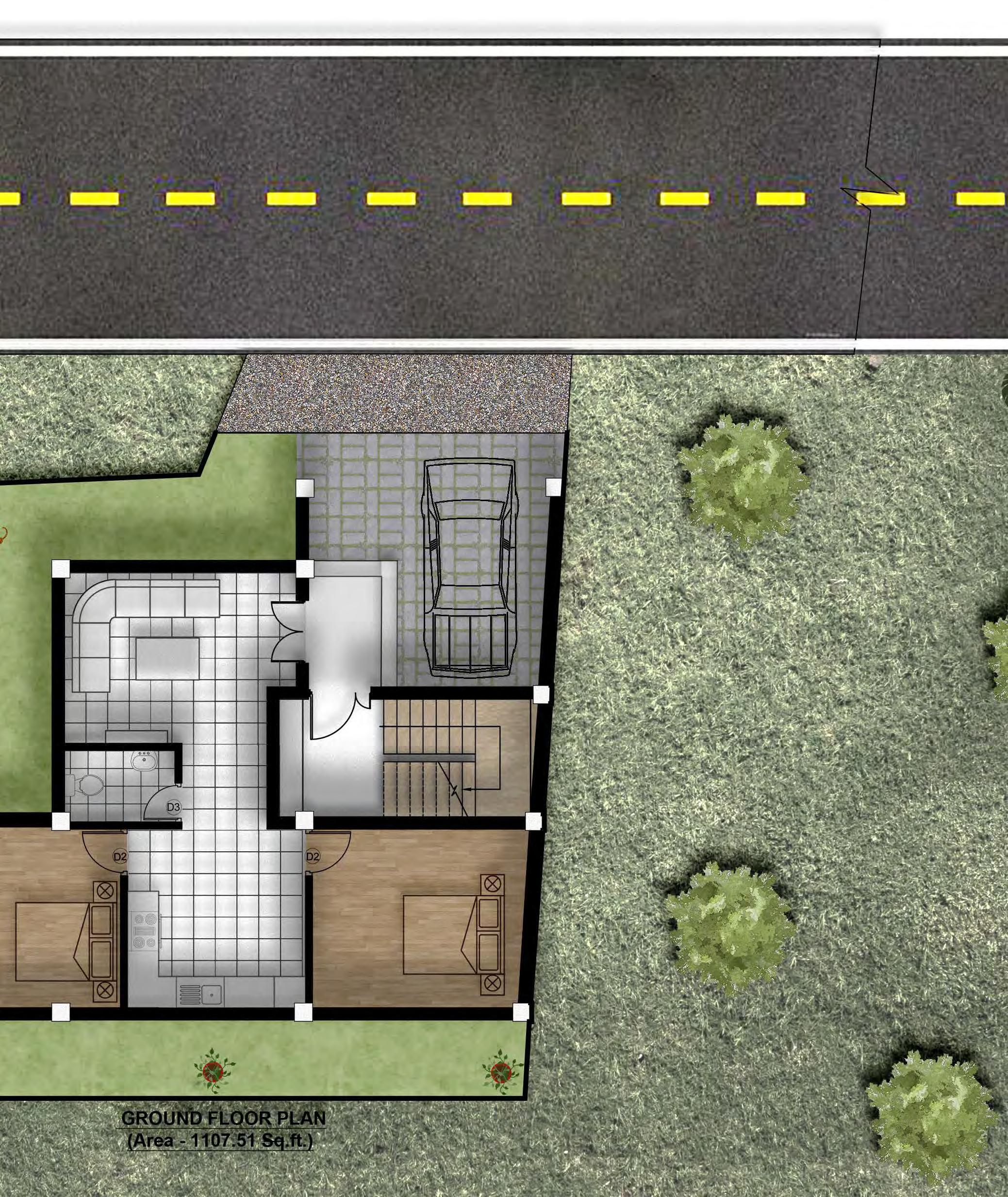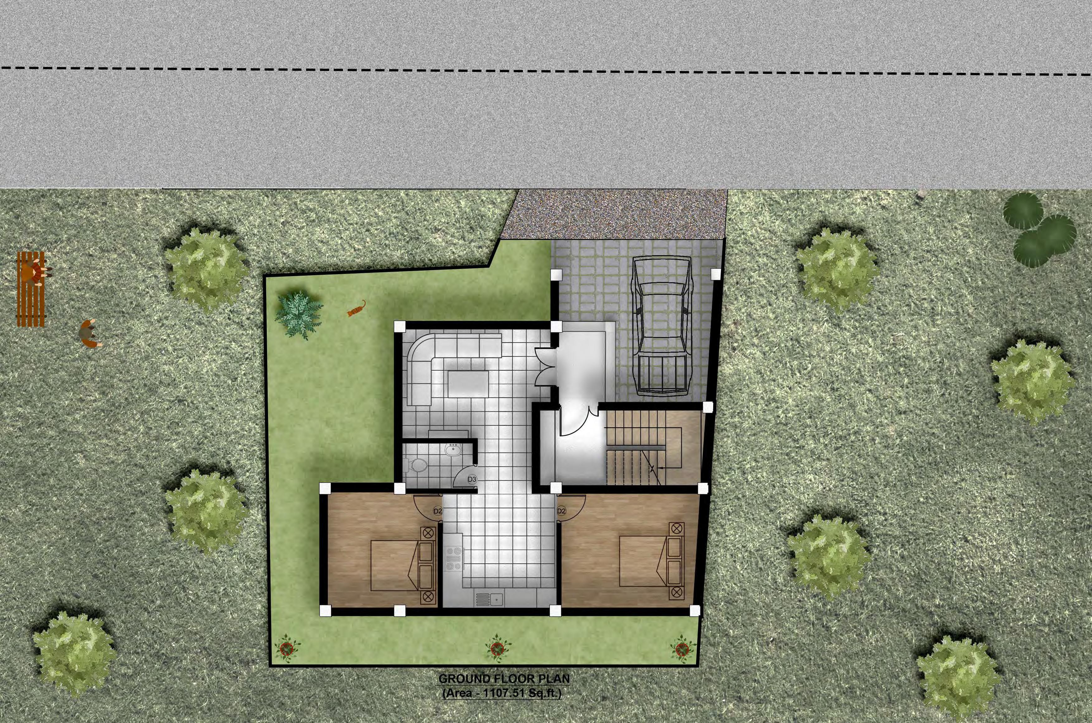GROUND FLOOR PLAN (Area - 1107.51 Sq.ft.) Living room 12'-11" X10'-10" TV D3 Bedroom D2 Bedroom 13'-9" X11'-5" Kitchen cum Dinning 11'-4" X11'-5" 11' X11'-6" C.Toilet 7'-1" X4'-7" D2 Up