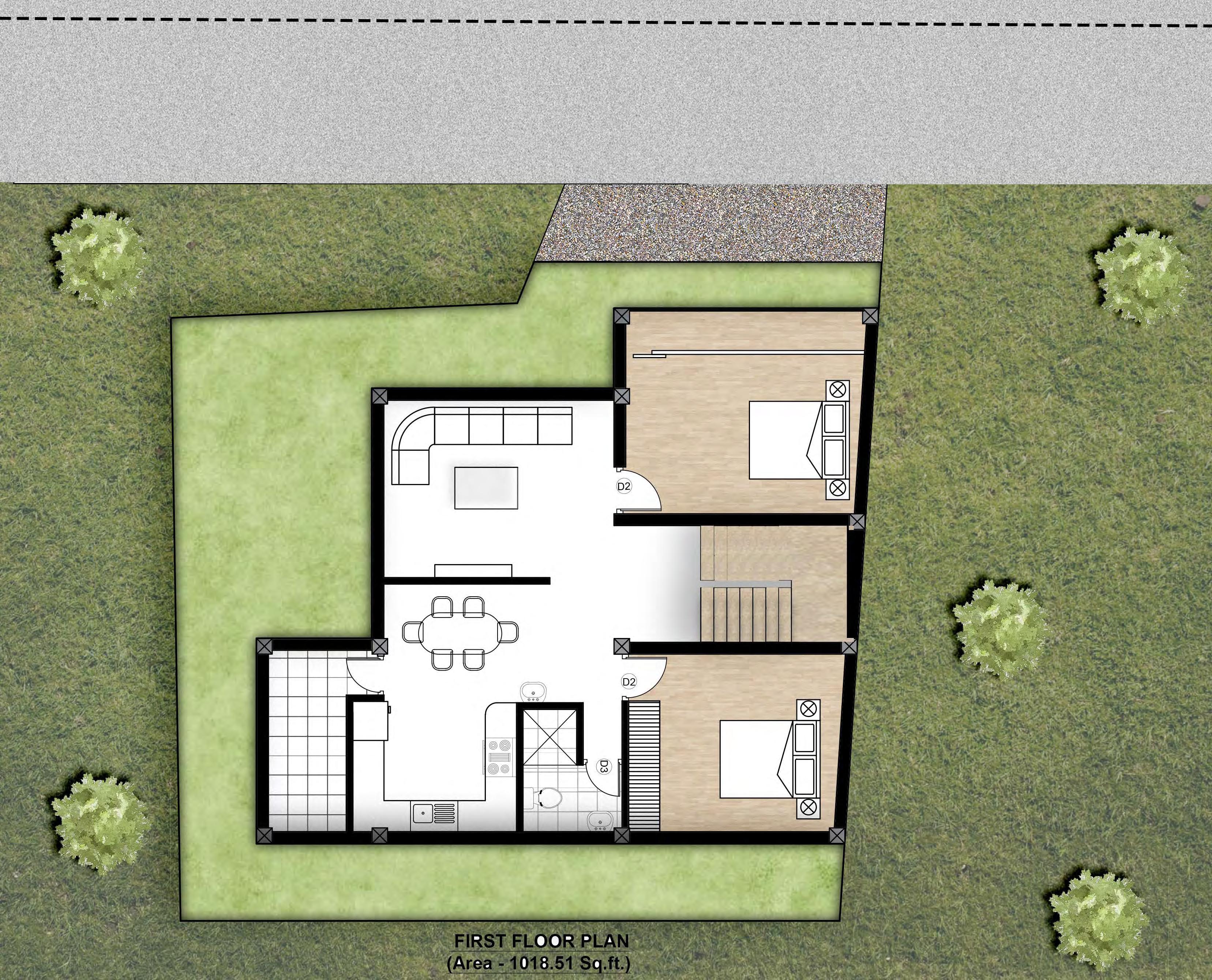Up TV D2 D2 C.Toilet 6'-2" X5'-5" D3 D3 D2 GROUND FLOOR PLAN (Area - 1018.51 Sq.ft.) Kitchen cum Dinning 18'-2" X9'-6" Bedroom 10'-11" X9'-6" Bedroom 13'-6" X10'-5" Living room 10'-4" X12' 2'
