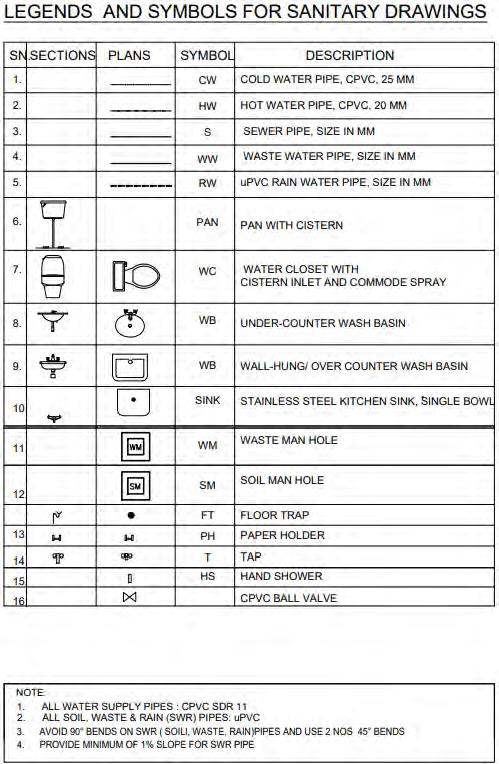 While doing sanitary drawing i mainly focuses on the hot water pipe, cold water pipe, soil stack pipe, waste stack pipe with the dimension of the pipe required for specific purposes and that depends on the DFU value (Drainage Fixtures Unit).