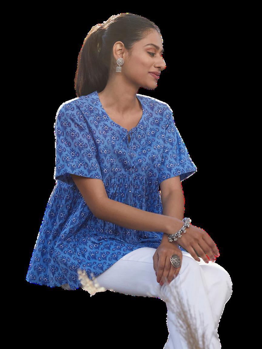 Nothing screams casual fun more than flowers. They cheer up your mood and spread happiness. When you are going for a relaxing day out on Saturday or Sunday, this blue cotton floral print tiered top is going to be your BFF.