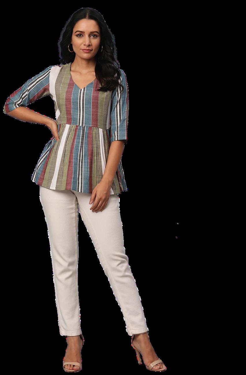 This top is perfect for both the office and your weekends, making it a must-have addition to your wardrobe. The multicoloured stripes are a fun and playful addition to your work attire. But the fun doesn't stop there!