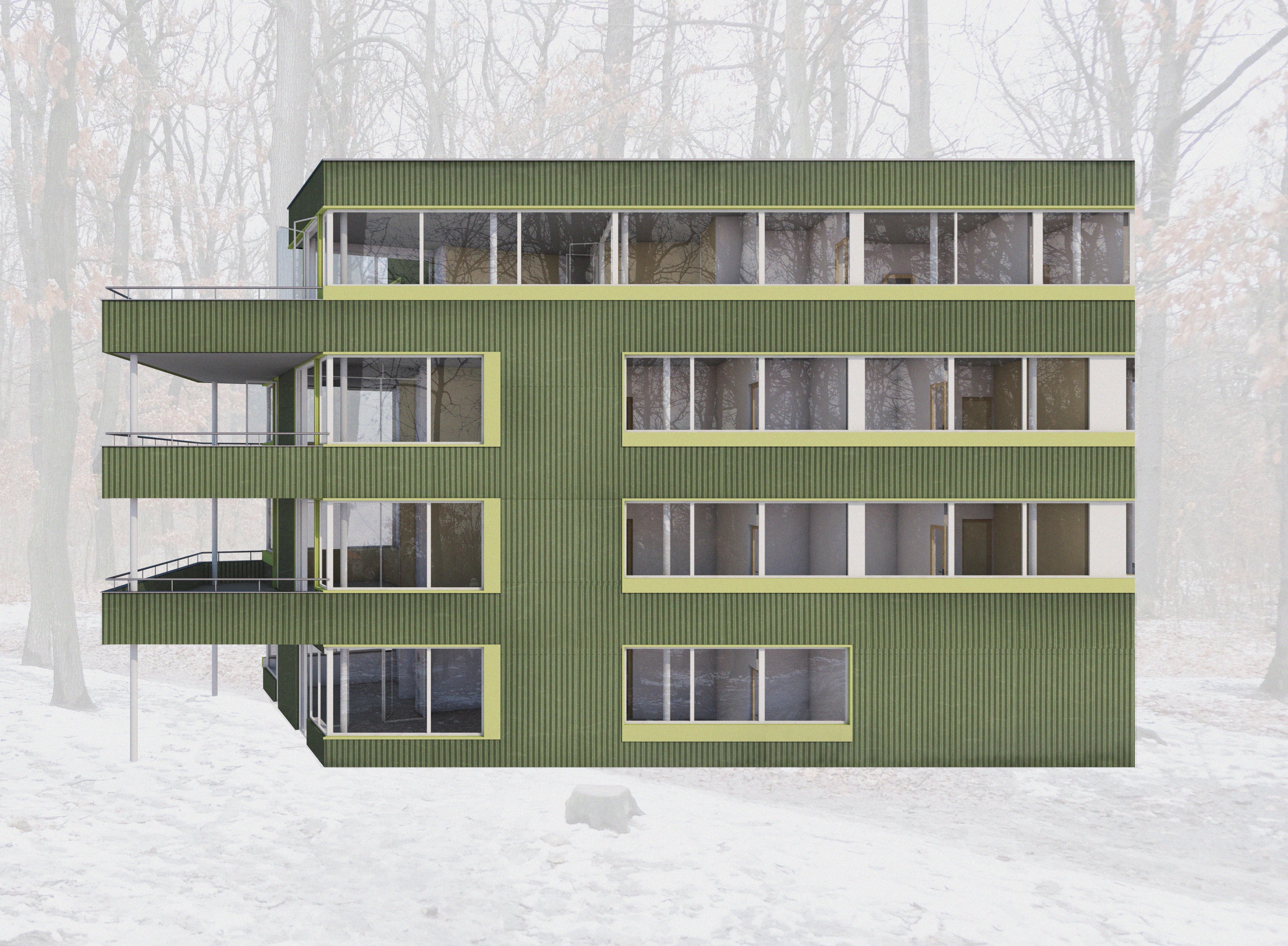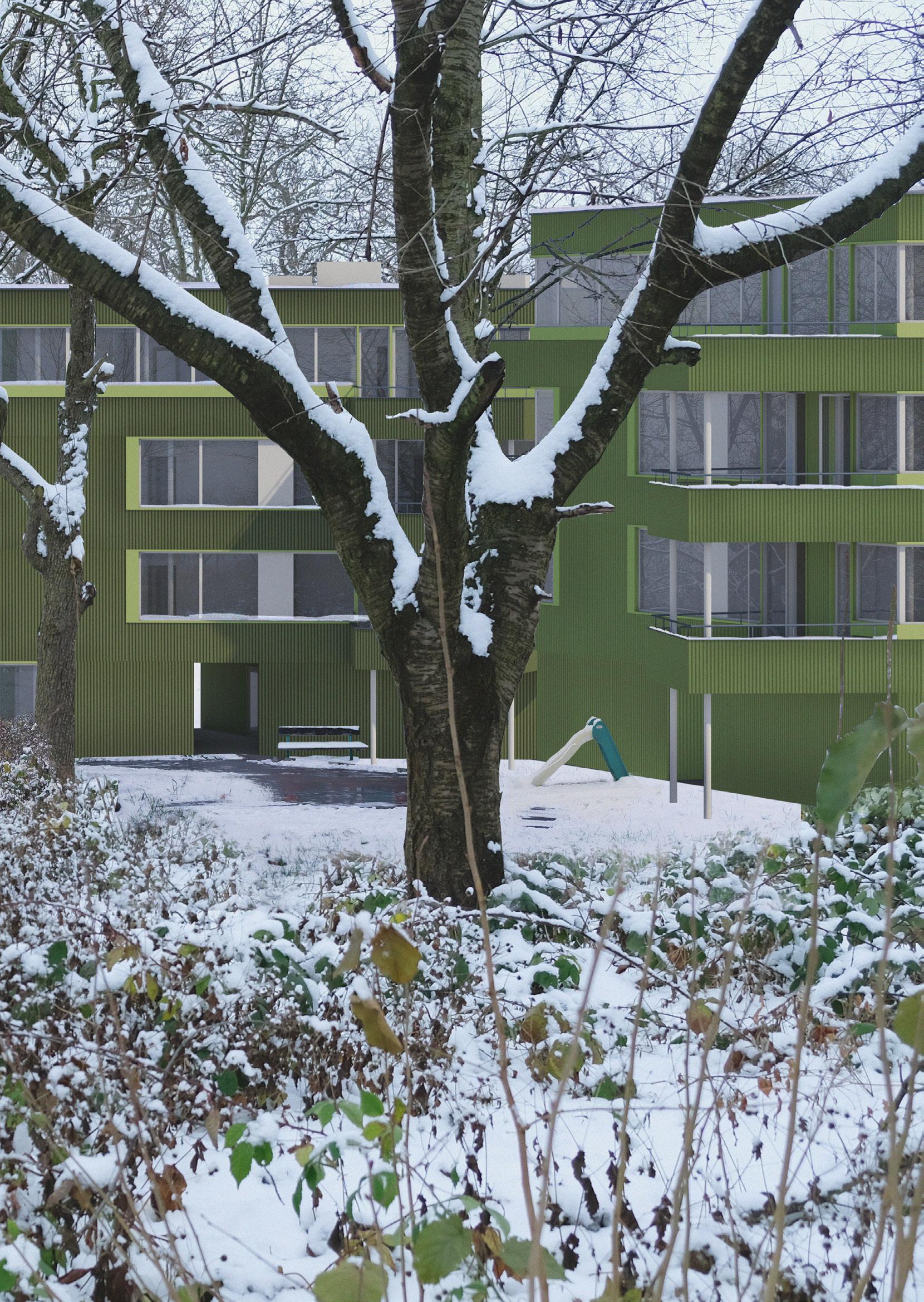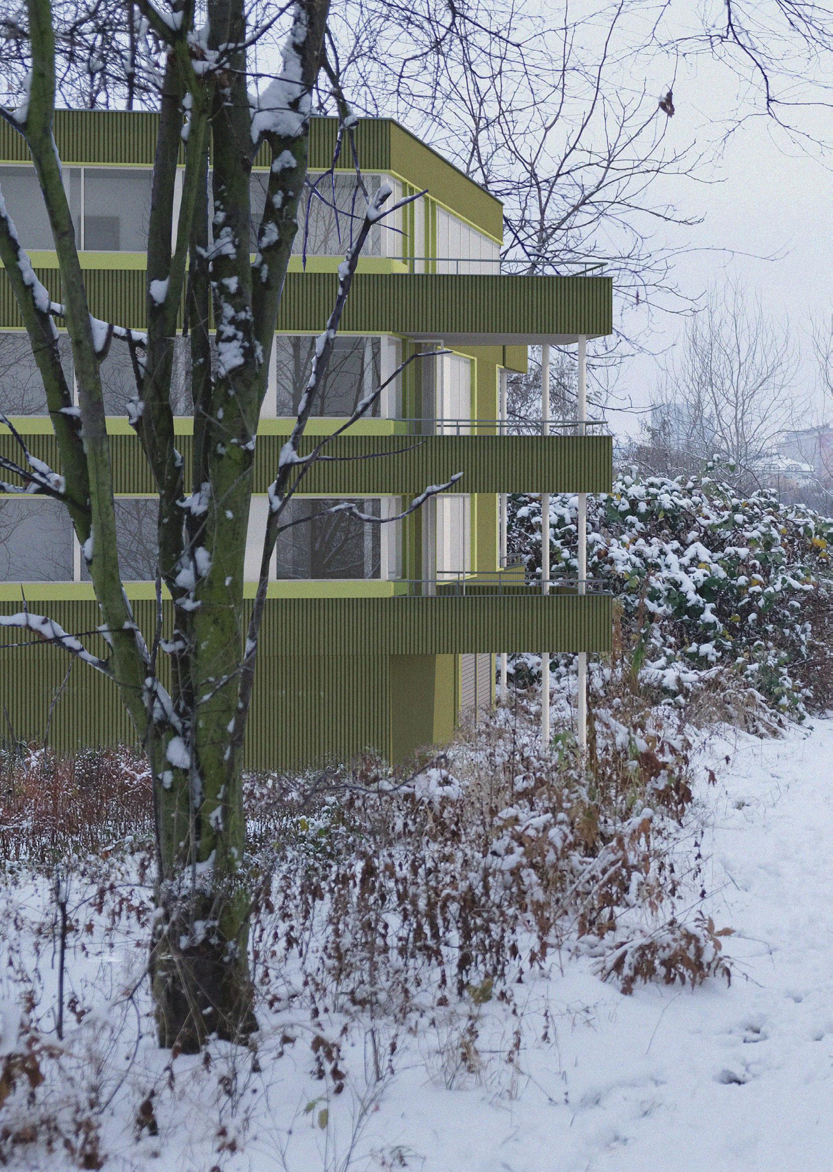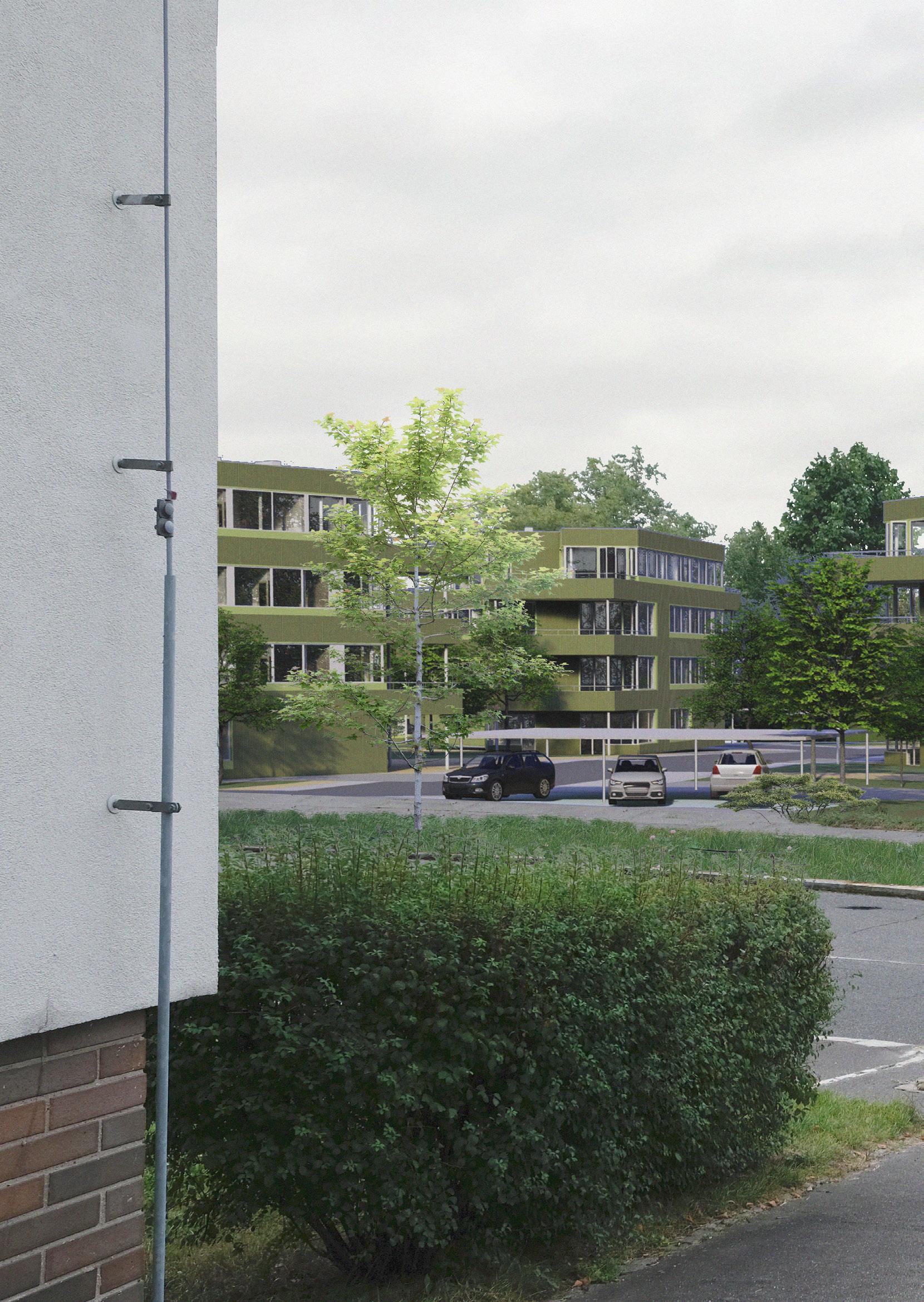 Dispozice bytů jsou proto navrženy tak, aby se mohl dům otáčet na různé světové strany a všechny byty byly přesto dostatečně osluněny. Domy jsou čtyřpodlažní. Typické jsou tři byty na patro, pouze v nejvyšším podlaží jsou dva byty na patro. Každý byt je doplněn o velkorysou lodžii, byty v přízemí mají k dispozici své soukromé zahrádky. Byty jsou určeny pro rodiny s dětmi, převládají dispozice 4kk, navrhuji však i 3kk a 2kk. Při navrhování bytů jsem si stanovila několik podmínek, včetně osvětlených koupelen, osvětlených kuchyní a osvětleného domovního jádra. Přízemí domů má několik variant, podle umístění domu na parcele. Díky zvolené konstrukci s pevným jádrem a nosnými stěnami napříč dispozicí a subtilnějšími sloupky u fasády mohou mít byty velká široká okna po celém obvodu. Vzhledem k tomu, že plášť neplní nosnou funkci, je proveden jako vyzdívka z porobetonových tvárnic se zateplovacím souvrstvím s provětrávanou mezerou. Fasáda je obložena vlnitým plechem lakovaným různými odstíny zelené.
