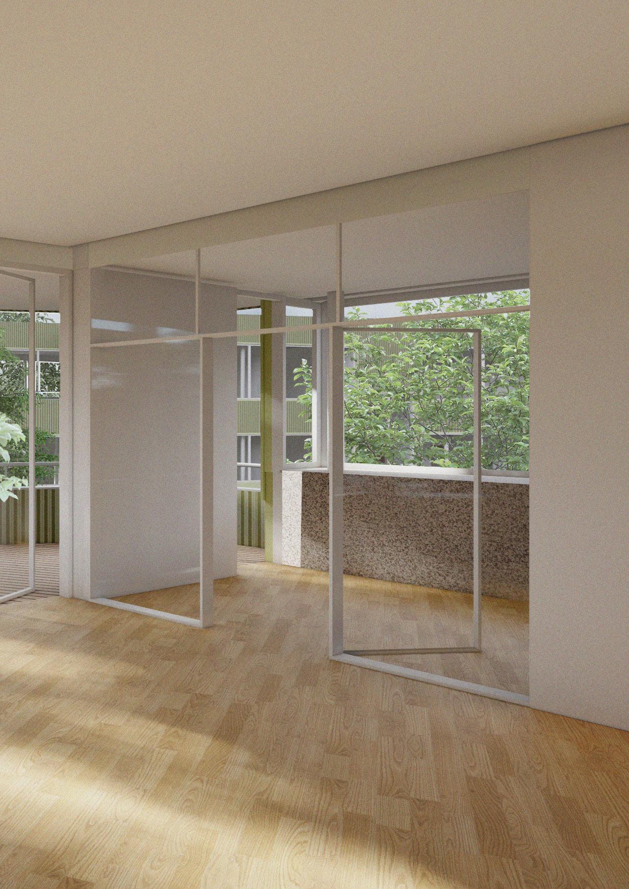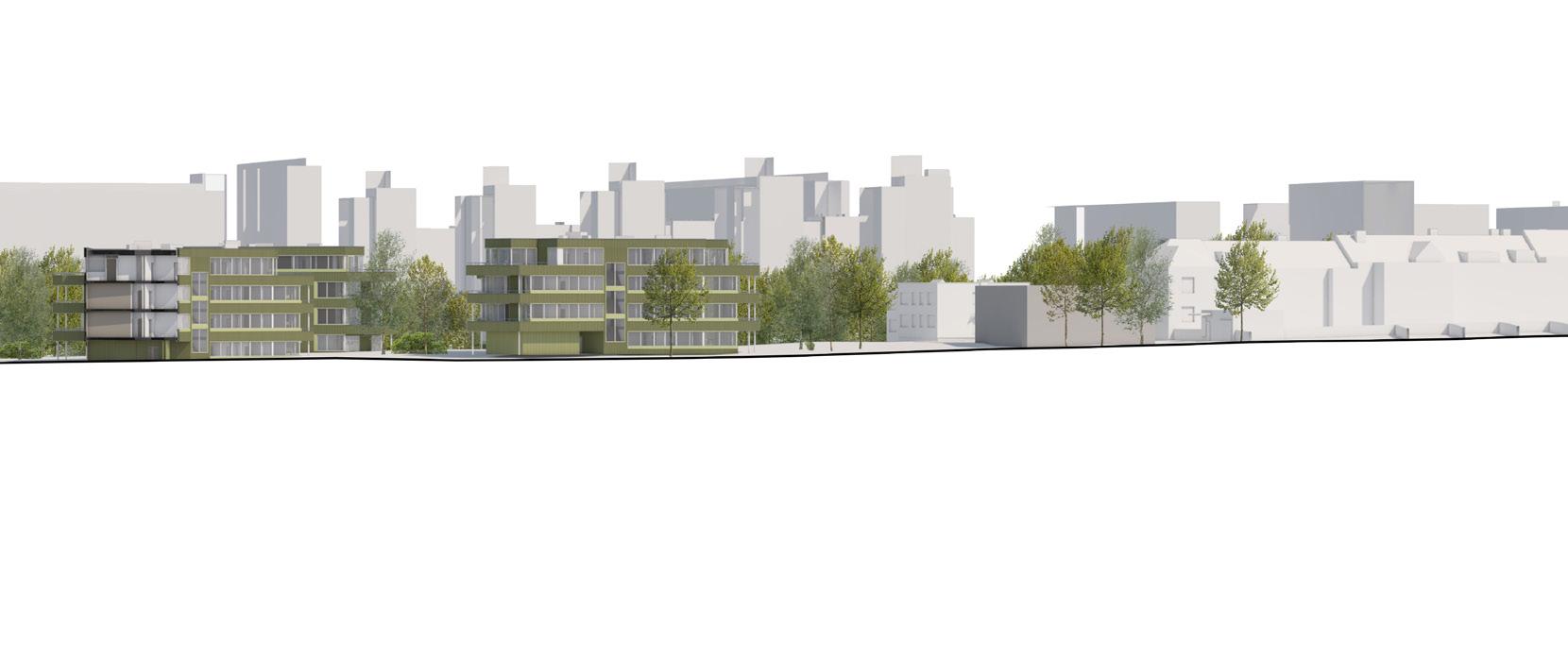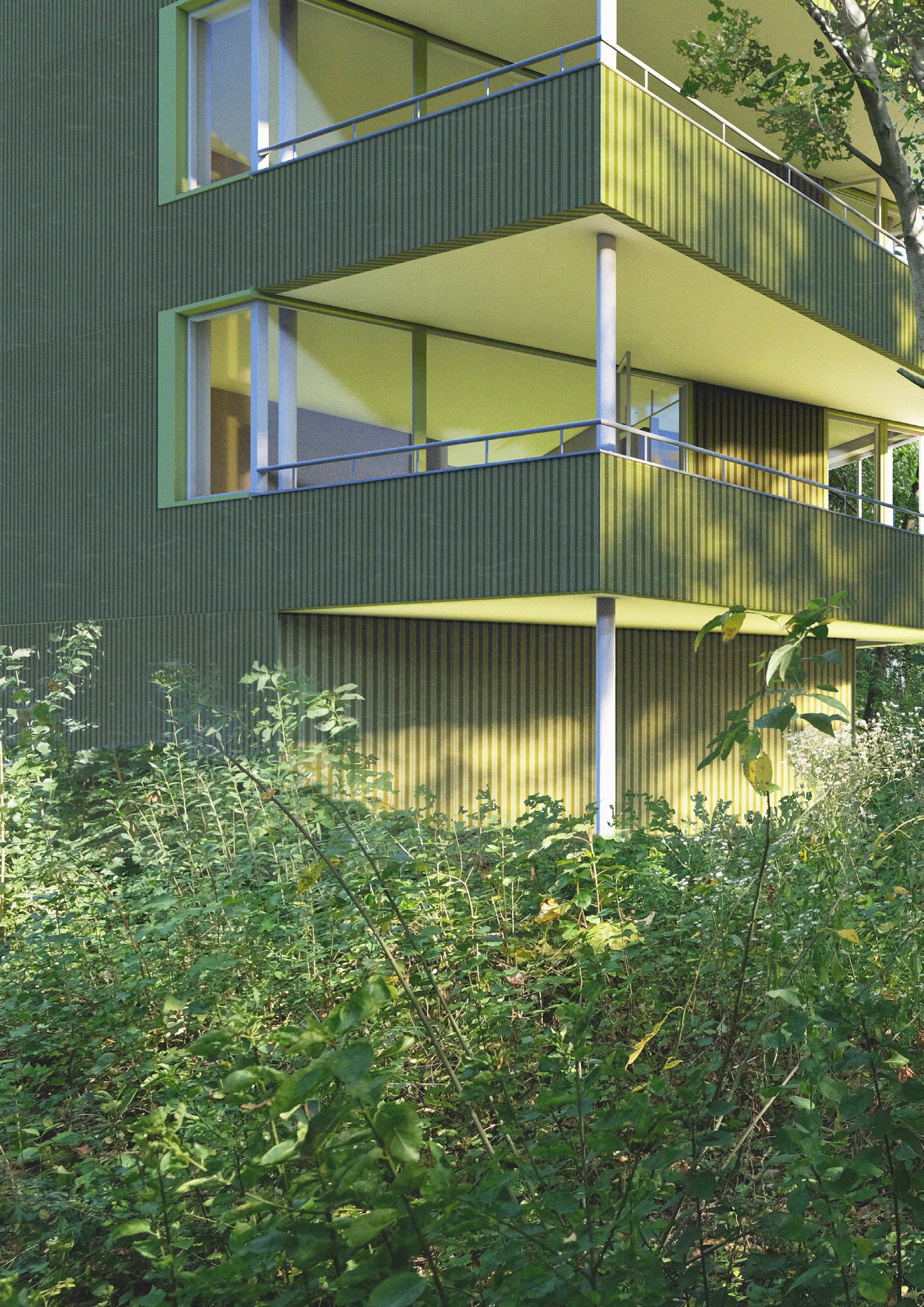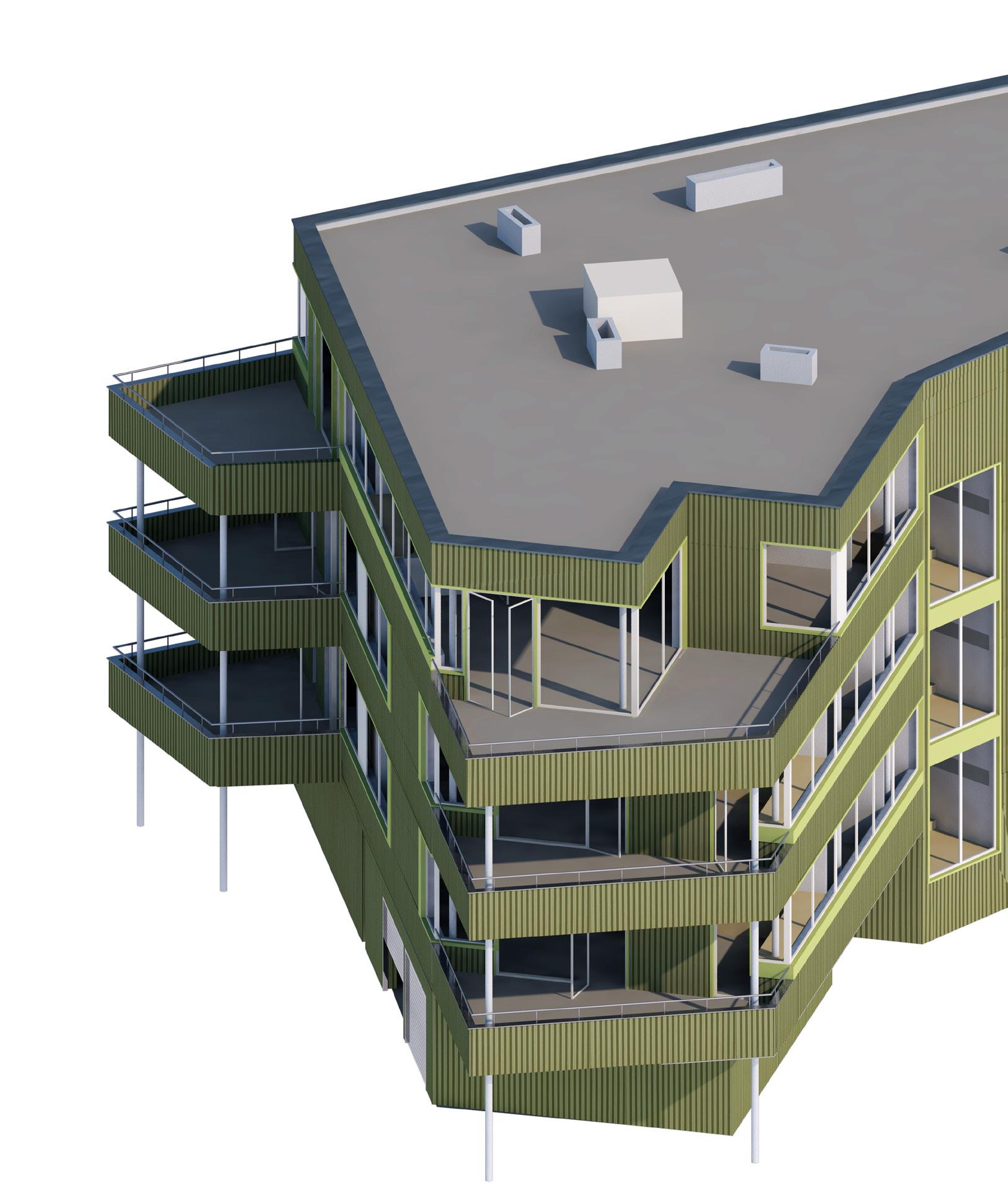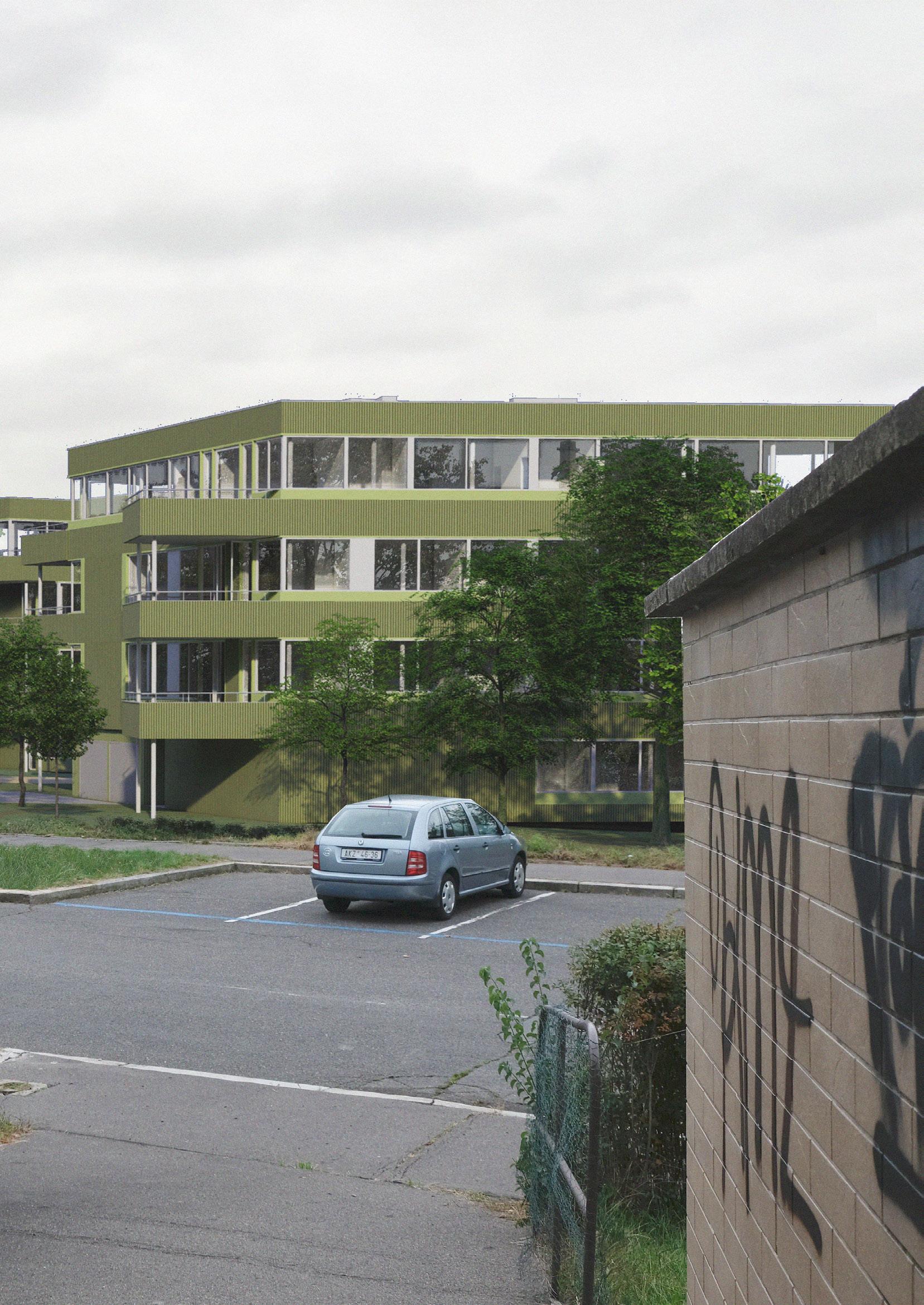 Dispozice bytů jsou proto navrženy tak, aby se mohl dům otáčet na různé světové strany a všechny byty byly přesto dostatečně osluněny. Domy jsou čtyřpodlažní. Typické jsou tři byty na patro, pouze v nejvyšším podlaží jsou dva byty na patro. Každý byt je doplněn o velkorysou lodžii, byty v přízemí mají k dispozici své soukromé zahrádky. Byty jsou určeny pro rodiny s dětmi, převládají dispozice 4kk, navrhuji však i 3kk a 2kk. Při navrhování bytů jsem si stanovila několik podmínek, včetně osvětlených koupelen, osvětlených kuchyní a osvětleného domovního jádra. Přízemí domů má několik variant, podle umístění domu na parcele. Díky zvolené konstrukci s pevným jádrem a nosnými stěnami napříč dispozicí a subtilnějšími sloupky u fasády mohou mít byty velká široká okna po celém obvodu. Vzhledem k tomu, že plášť neplní nosnou funkci, je proveden jako vyzdívka z porobetonových tvárnic se zateplovacím souvrstvím s provětrávanou mezerou. Fasáda je obložena vlnitým plechem lakovaným různými odstíny zelené.