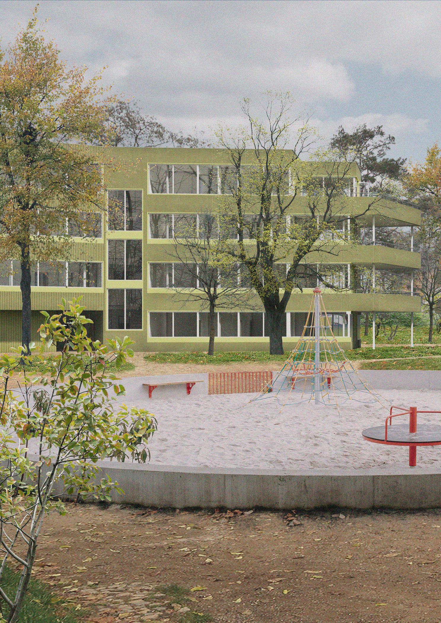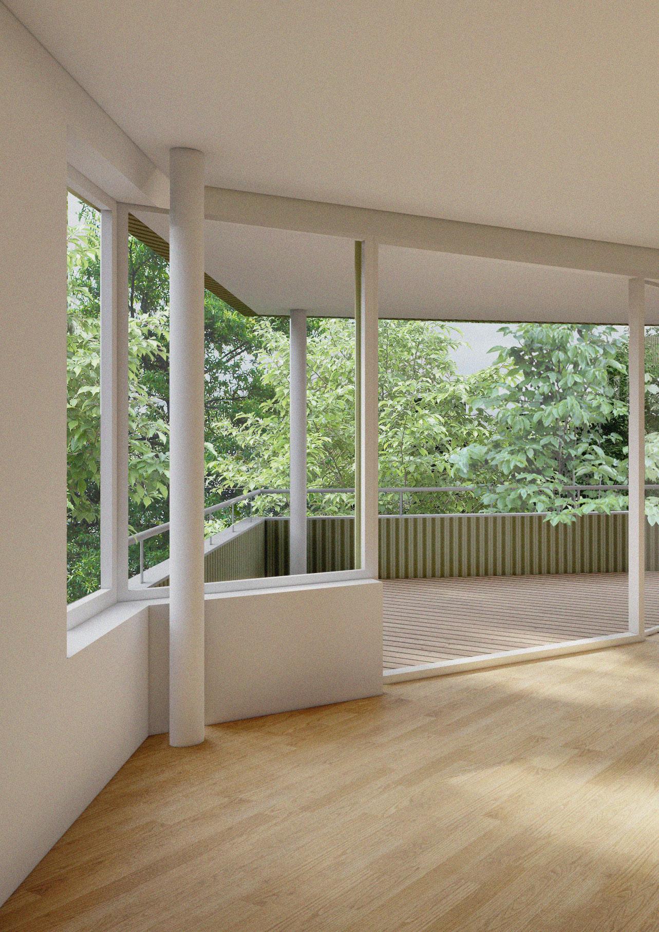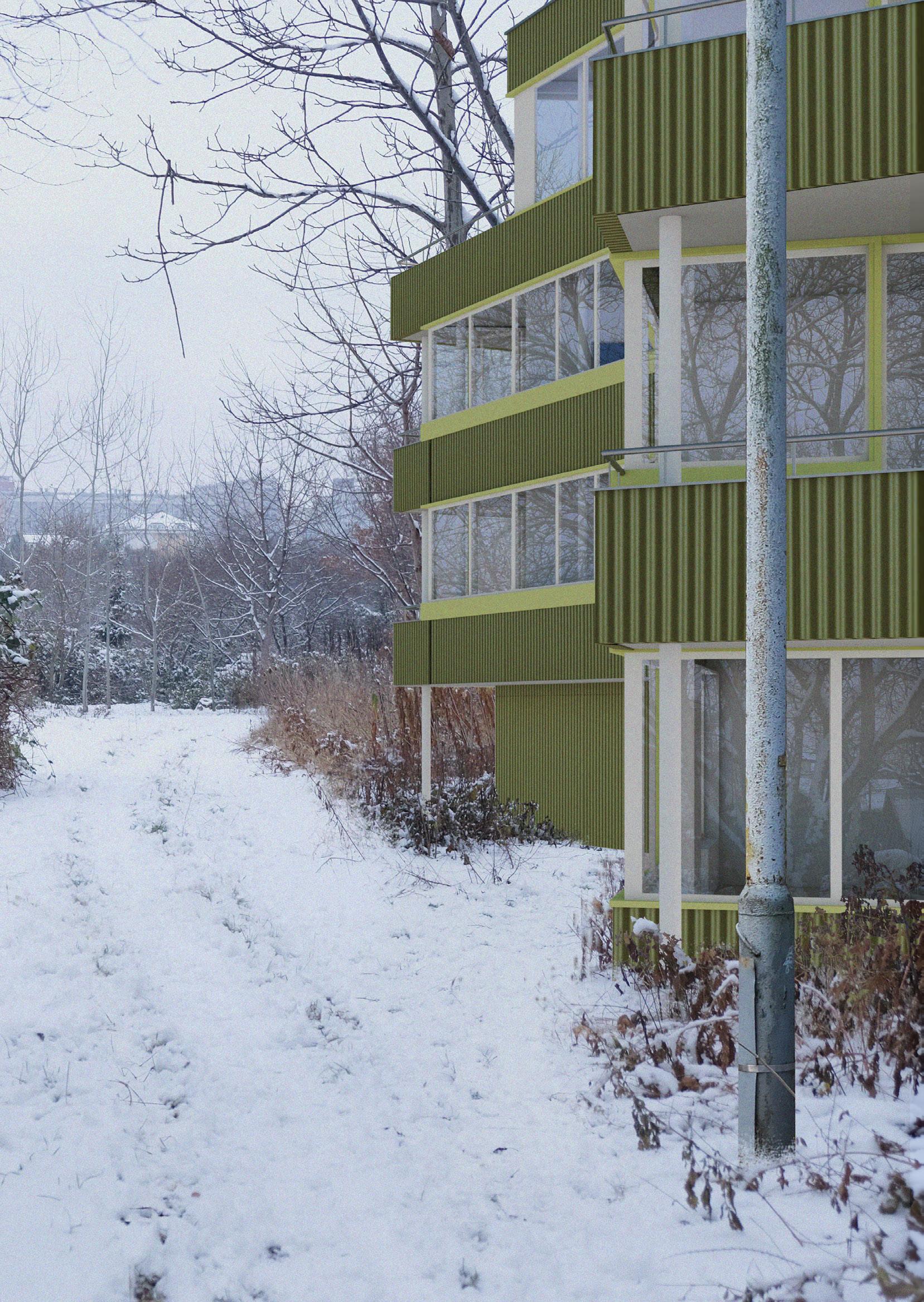 Dům navrhuji jako altán v zeleni. Altán s pevným jádrem, kolem kterého jsou rozmístěny jednotlivé místnosti. Navrhuji byty s výhledy do korun stromů, co si navzájem se sousedním bytem nekoukají do oken. Zakřivený a asymetrický tvar domu vychází z dispozic bytů. Dům tak dokáže svým natočením tvořit různé charaktery a typy prostorů, přes dvůr až po ulici.