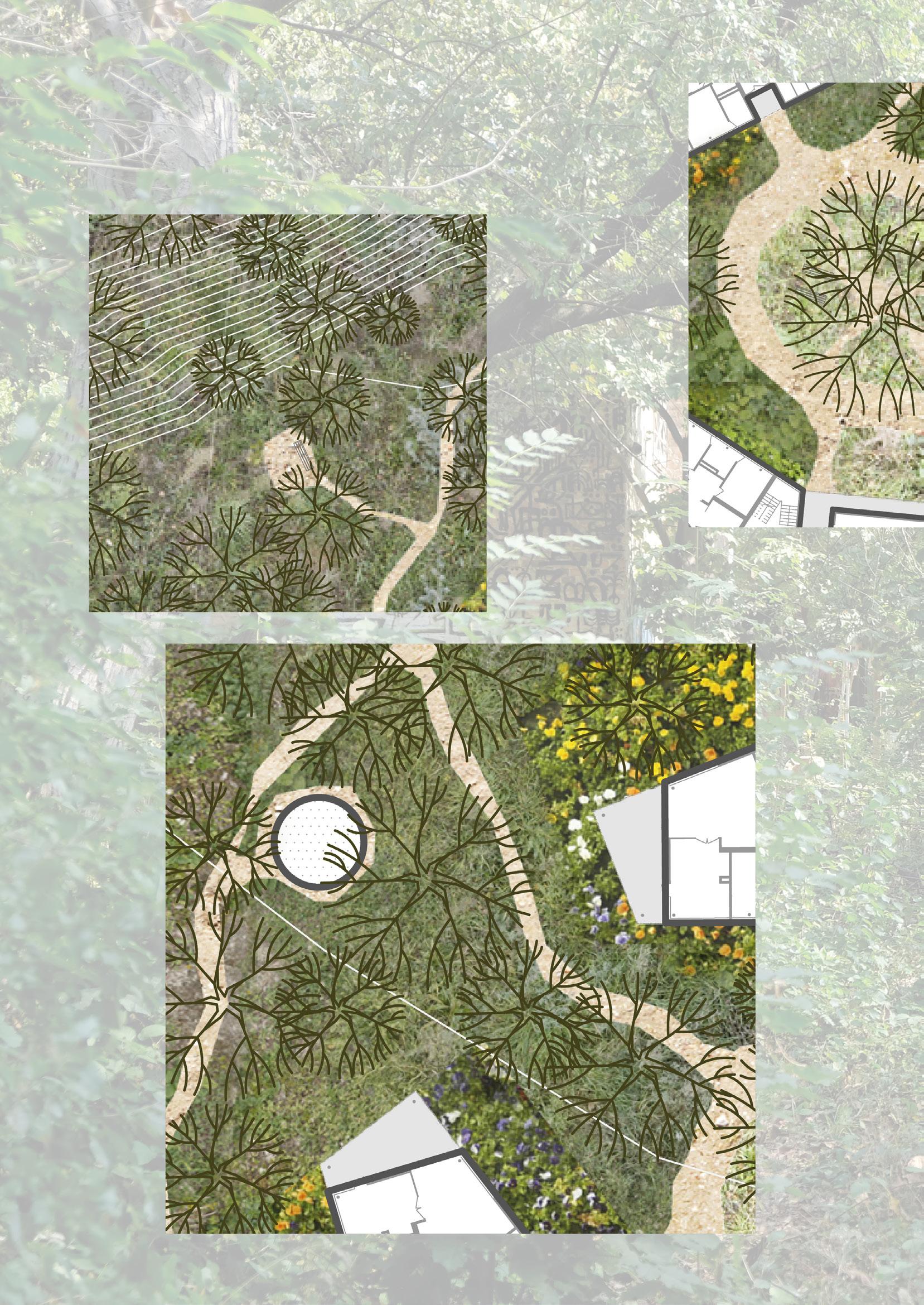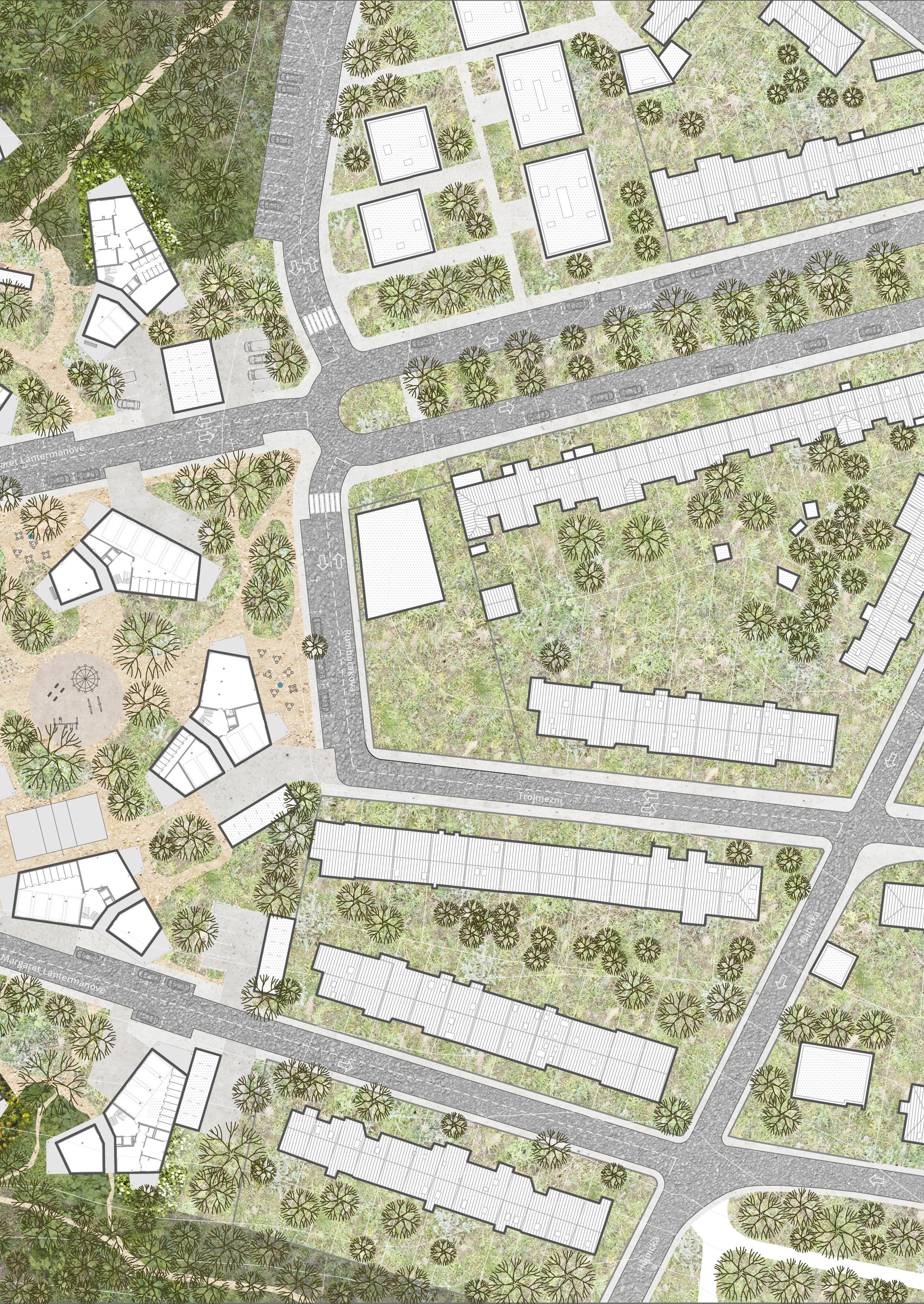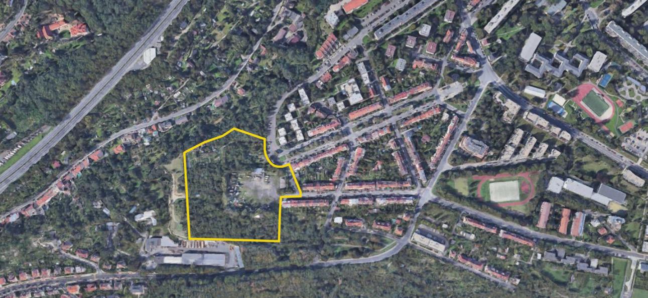 Zadaným tématem diplomové práce je bydleníhledání zahradního města. Po první návštěvě parcely jsem si však uvědomila, že mi na toto konkrétní místo nepřijde vhodné navrhovat zahradní město. Místo hledání zahradního města jsem se proto rozhodla hledat město v lese. Namísto bydlení se zahradou navrhovat bydlení v přírodě. Jako jeden z největších potenciálů parcely totiž vnímám její zarostlost, divokost. Fascinuje mě, jak z této džungle postupně vykukují přístřešky, chatky, ale i celé domy a život kolem nich. Ambice projektu byla do tohoto prostředí navrhnout kvalitní současné bydlení a navazovat spíše než na sousední řadovky právě na stávající přírodu na parcele. Zadaná parcela mi totiž přijde speciální právě v tom, že se nejedná o zcela prázdnou pláň, na které nic není. Nestavíme na ‚zelené louce‘, ale na parcele ve vnitřní periferii města, která byla zapomenutá tak dlouho, až sama znovu ožila. Velkou inspirací pro mě byla finská a švédská sídliště navrhovaná do lesa nebo na jeho okraj. Dalším tématem v mém návrhu pro mě bylo vymezení se vůči sprawlům. Ne tolik kvůli důsledkům, které má nízká hustota zalidnění, pro sídelní kaše tak typická. Spíše kvůli dokonale definovanému a danému prostředí. Dům - zahrada - plot - chodník - silnice. Rozhodla jsem se proto navrhnout zástavbu, která nebude kobercová. Naopak chci prostor mezi domy mnohem méně určený, ohraničený, definovaný, avšak s jasnou hierarchií podle umístění na parcele.
