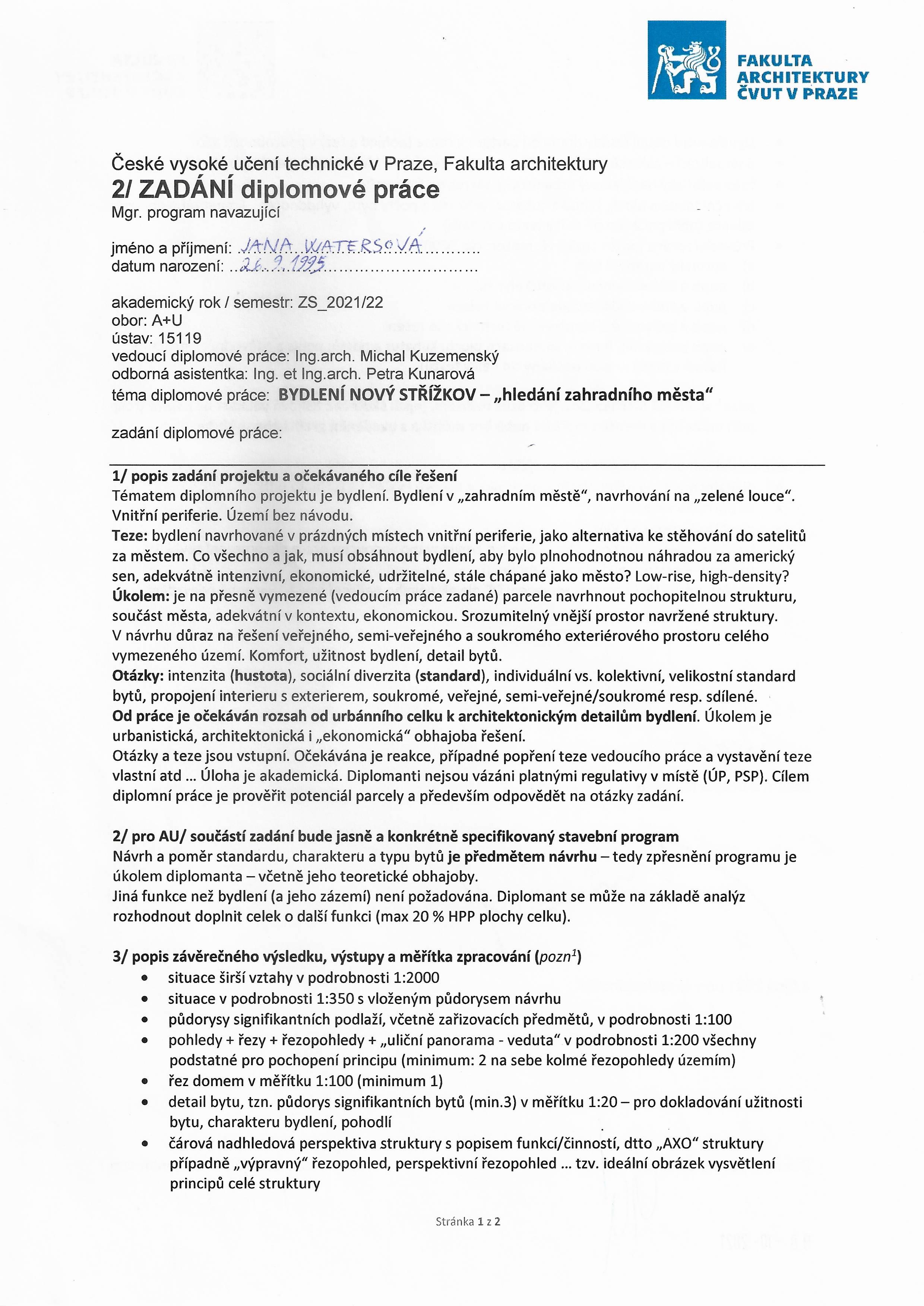 autorka práce: Bc. Jana Watersová vedoucí práce: Ing. arch. Michal Kuzemenský odborný asistent: Ing. et Ing. arch. Petra Kuntarová oponent práce: MgA. Miroslav Chmel