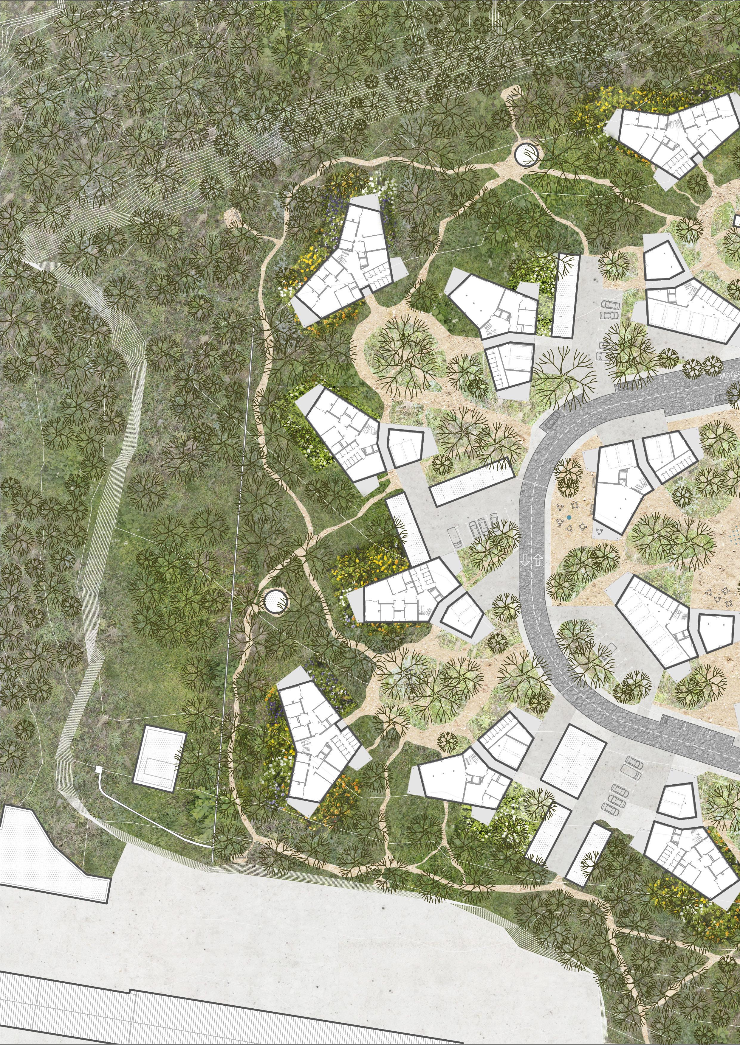 Navrhuji jeden dům, který na parcele multiplikuji celkem 16x. Domy jsou uspořádány do trojic, které mezi sebou tvoří své vlastní dvory. Celým zadaným pozemkem vedu jednu ulici - obytnou zónu. Pro dostatečnou dopravní obslužnost nejvzdálenějších domů navrhuji do každého dvoru mlatovou cestu širokou čtyři metry. Tyto cesty jsou určeny výhradně hasičům, poště, či v případě stěhování je možné zajet přímo ke vchodu do domu. Atypickým clusterem jsou domy ve středu parcely, které jsou z vnějšku obehnány ulicí a uvnitř mají centrální dvůr s dětským hřištěm. Tento dvůr je od ulice oddělen domy, podélnými parkovacími stáními nebo trávou. Takto je navržen záměrně, aby byl vhodný pro umístění hřiště a kluboven, kaváren či obchodů v parteru domů. Z celého návrhu je právě zde nejvyšší míra sociální kontroly. Vedle řadových domů v ulici Chrastavská navrhuji dvoupodlažní budovu na pronájem. V projektu navrhuji po obvodu parcely lesní vyšlapané cestičky, několik vyhlídek a dva altánky schované v lese. Domy se na celé parcele přizpůsobují její morfologii a postupně směrem k hraně klesají.