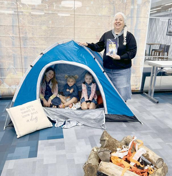 In the new book a “squad” of boys have adventures while camping, so a tent and fake campfire was part of the fun. Inside the tent are Elizabeth, Charlie and Jezamae Woods, while Jill holds a copy of her newest book.