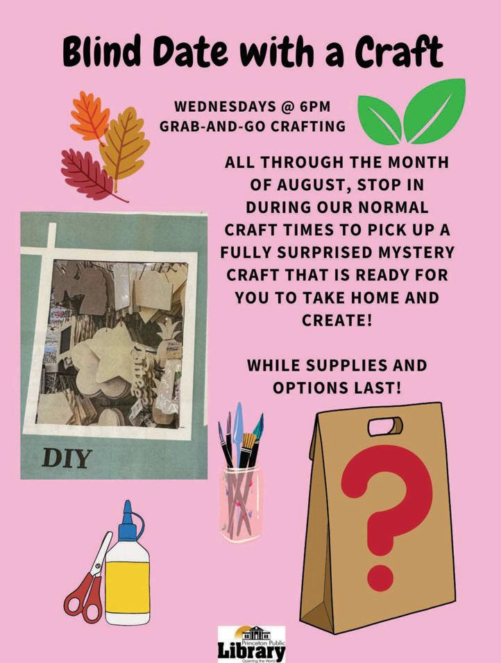 Adult Craft Night 6pm Back by popular demand, this month we will be featuring Blind Date with a Craft! Come grab a readily supplied bag filled with everything you need to make a fun at home craft! While supplies last!