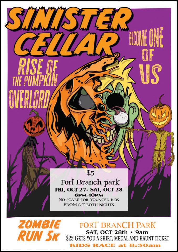 special volunteer is Don Steinmetz, who took over the Zombie run. Early Saturday morning little kids line up and run a short course through Fort Branch and spot Zombies. After that, the adult fun begins with a 5K through the city where those Zombies come to life and give a surprise and short chase, complete with themed music and a fog machine. It’s like flag football and the winners outrun the Zombies and return with their flags. Last year there were about 170 runners sprinting around Fort Branch for fun. After the run at 11 a.m., the Cellar will be the backdrop for “Boo at the Park” so the young kids can have a traditional costume contest, parade and candy.