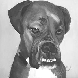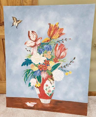Maryann’s personal style is to use big, bold, bright colors with a great attention to detail. She loves gardening, so it’s no surprise that many of her paintings are of floral scapes. She smiled as she offered that she’s done a few puppy portraits as well. One of the things on her bucket list is to have her work displayed at The Rumjahn Gallery in Evansville. That wish is getting close to being checked off the list. She is also toying with the idea of doing a faithbased art series.
