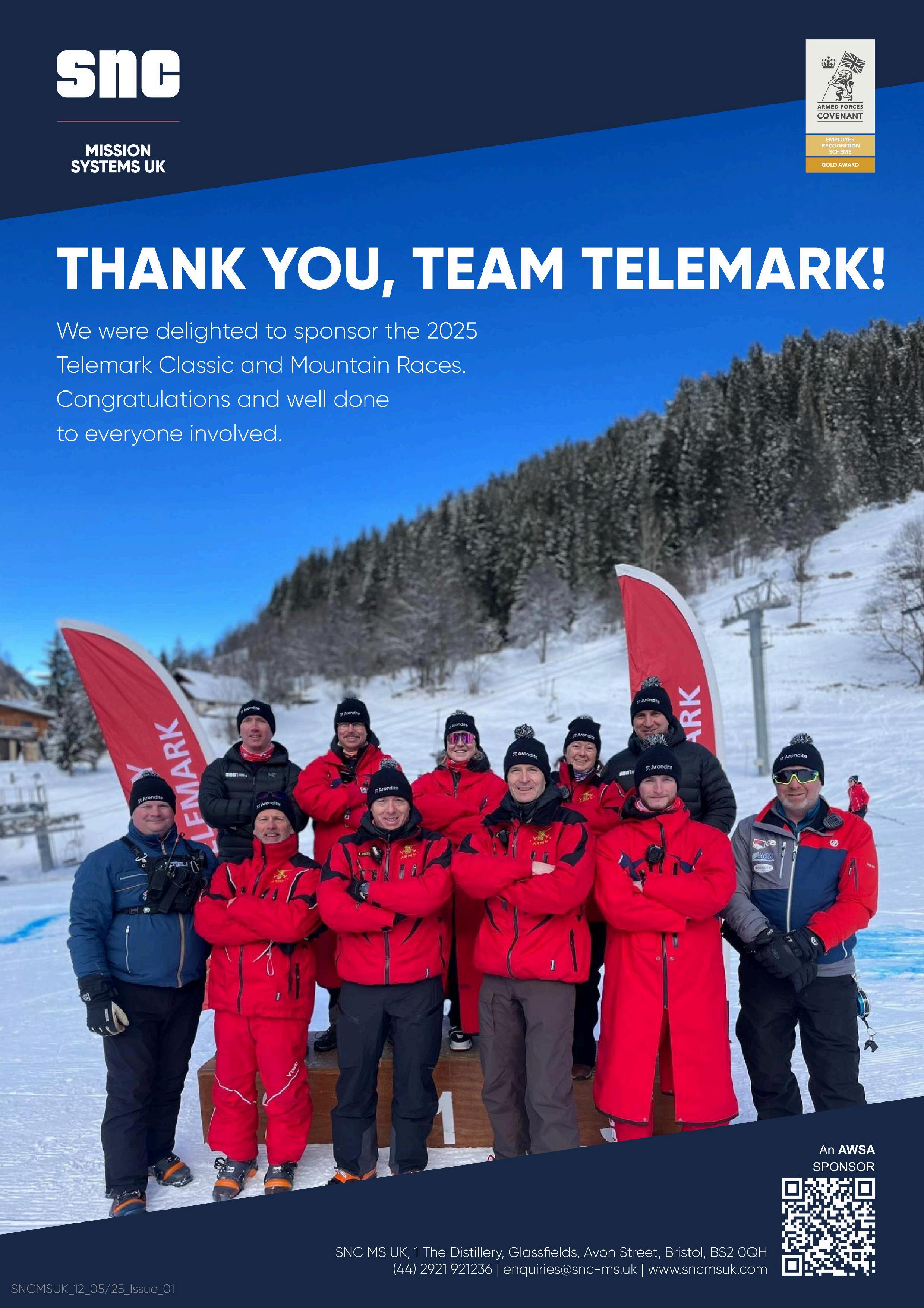 Army Telemark would like to thank all those behind the scenes who make this sport possible: Pralognan-la-Vanoise for hosting us, the AWSA for their endless support, and Maj (Retd) Martin Triggol RM, our Technical Delegate, who keeps us safe. A very special mention is also needed to recognise the contribution of Lt Col Daz Howells RE to Army Telemark Like most Army competitors, he was introduced to Telemark skiing through its military application in Norway, where it is the way to move over snow with heavy equipment He has represented the Army for over 14 years during his career and has been a stalwart member, and then Captain, of the Army Team for many years We wish him all the best for his retirement and many bluebird days ahead