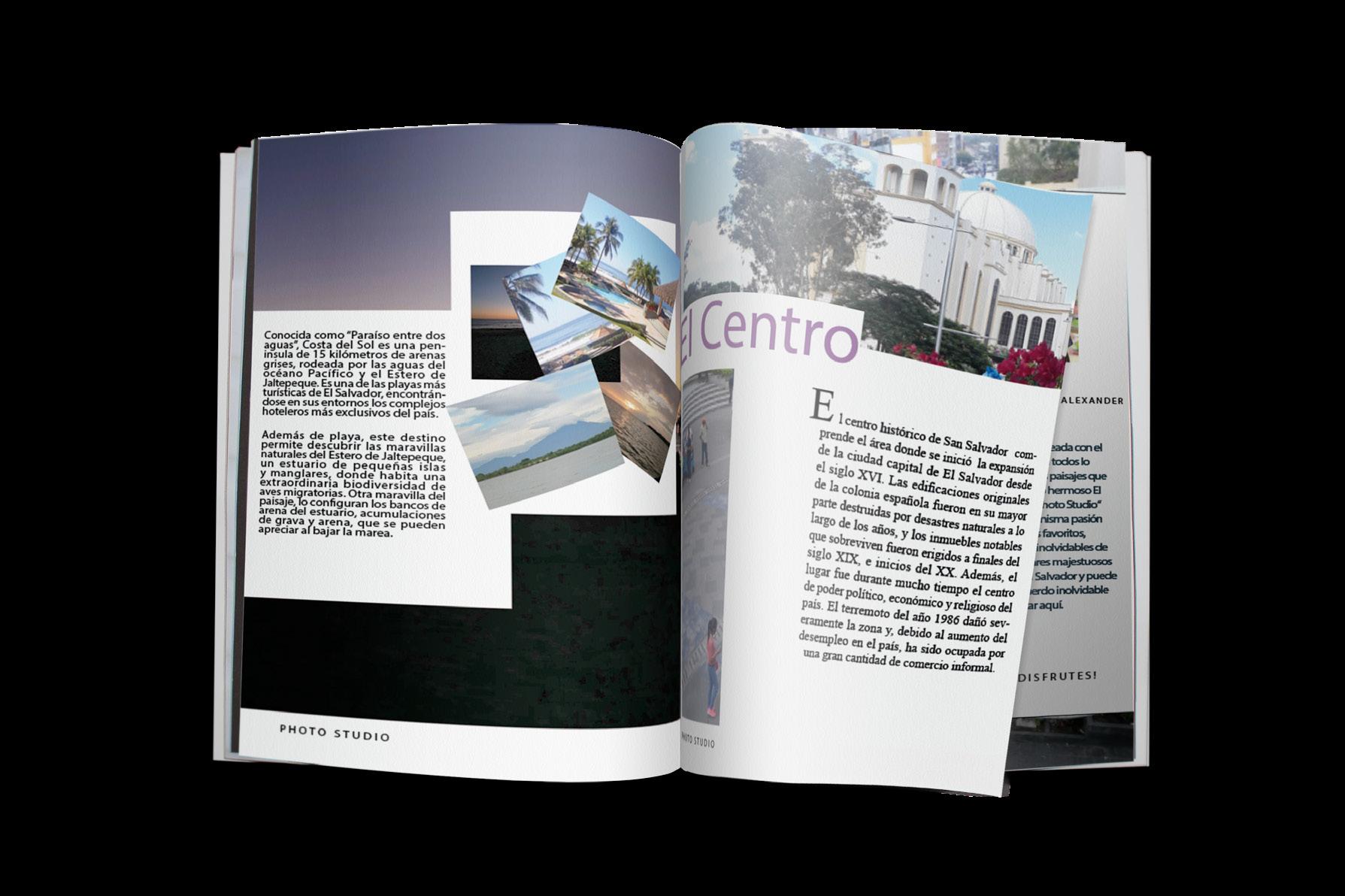 Desarrollé está revista publicitaria llamada "Photo Studio" enfocado en el turismo de El Salvador para todos aquellos turistas que nos visitan y buscan una exelente experiencia para visitar lugares turisticos y escondidos en todo nuestro pais.