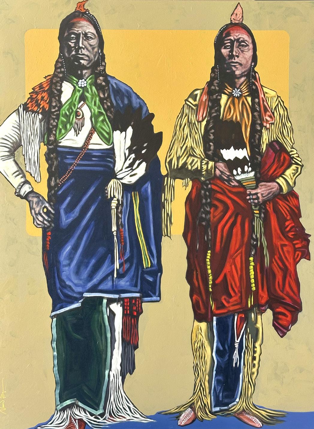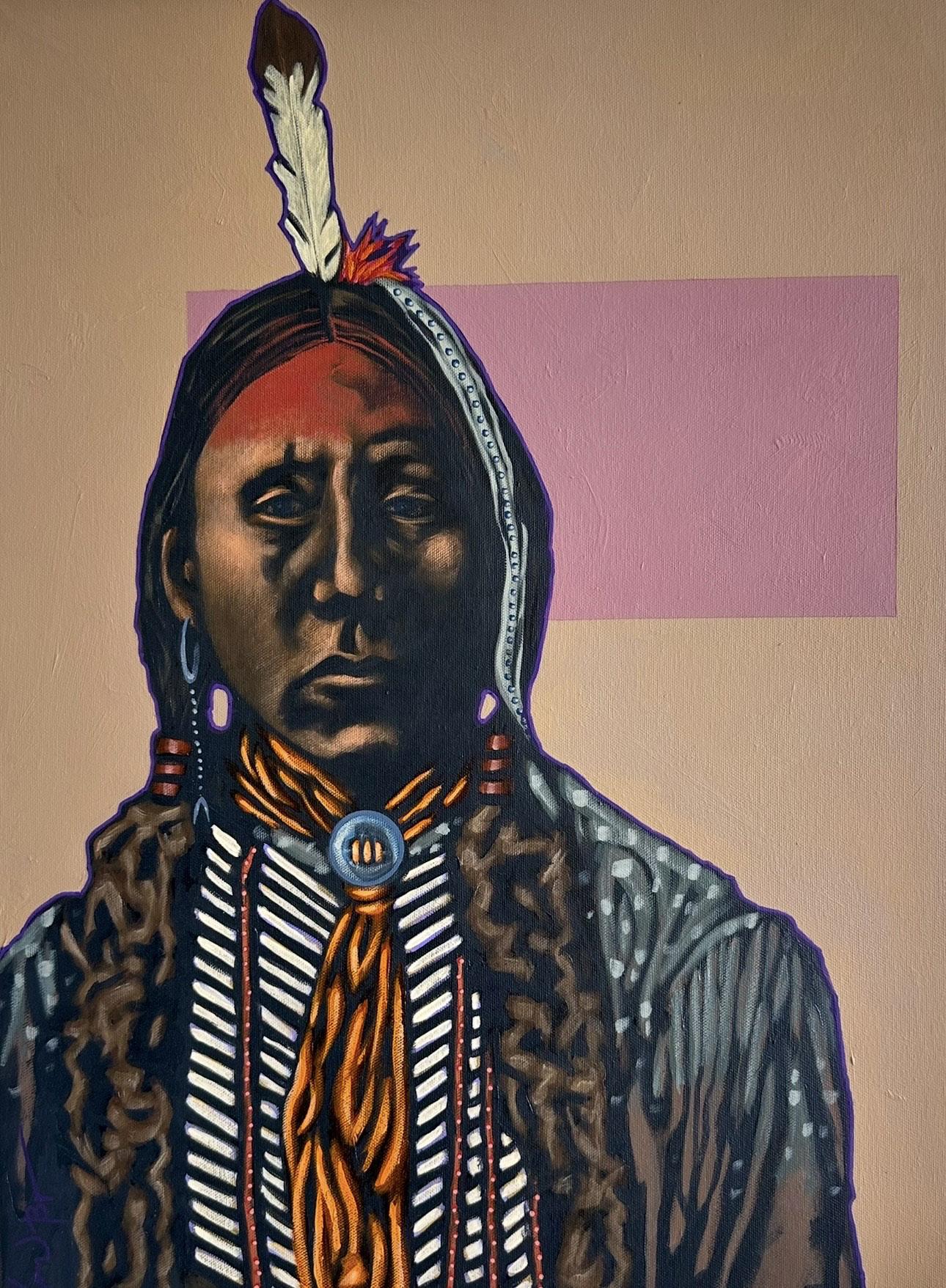 Nocona Burgess (Comanche Nation of Oklahoma) creates bold, contemporary portraits of Indigenous men and women from tribal Nations across North America. Drawing on meticulous research, firsthand knowledge, and vibrant color palettes, Burgess pairs crisp facial details with traditional regalia to explore the identity, history, and cultural narratives of each subject—challenging outdated perceptions of Native people and reframing Native American portraiture for a modern era.