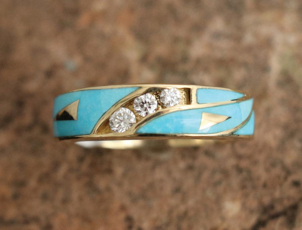 14kt Yellow Gold Ring with Diamonds and Sleeping Beauty Turquoise Inlay by