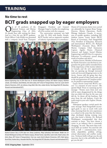 Nautical Sciences Class of 2014: Back row: Danny Lundstrom, Philip Sutherland, Reid Graham. Middle row: Dr. Richard Wiefelspuett (A/Dean, BCIT Marine Campus), Michael Fischer, Cody Kirlik, Austin Smith, Robert LeGars, Kim Dotto (Dean, BCIT School of Transportation). Front row: Laurie Sterritt (Board of Governors, BCIT), Mark Spence, Brock Kitzel, Andrew Barry, Alexander MacPhee, Paul Dangerfield (VP, Education, Research and International BCIT). 40 BC Shipping News September 2014